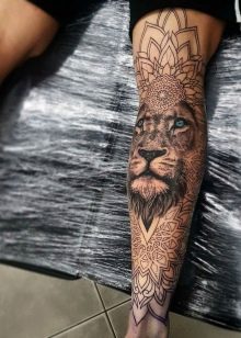 Tiere sind nicht weniger beliebt. Männer bevorzugen Skizzen, die einen Löwen (ein Symbol für Macht und Herrschaft) oder einen Tiger (ein Symbol der Ruhe) darstellen. Um ihre männliche Stärke und Aggression zu demonstrieren, entscheiden sich Vertreter des stärkeren Geschlechts oft für Tiere wie: Wolf, Drache, Schlange, Stier.