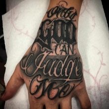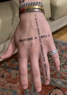 Eine sehr beliebte Lösung bei Männern ist ein Tattoo in Form einer Inschrift mit einer bestimmten Bedeutung. Solche Kompositionen können sich auf unterschiedliche Weise unterscheiden, zum Beispiel: die Sprache der Darbietung, Variationen von Schriftarten, Farbwiedergabe. Die semantische Aussage dieser Bilder stellt sich natürlich auch als ganz anders heraus.