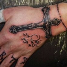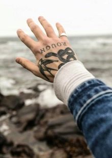 Bevor Sie sich entscheiden, die ausgewählte Zeichnung auf die Hand zu übertragen, ist es ratsam, sich mit allen Nachteilen einer solchen Lösung vertraut zu machen. Ein Mann sollte die Vor- und Nachteile einer solchen nicht trivialen Körperkunst abwägen, um später eine vorschnell getroffene Entscheidung nicht zu bereuen.