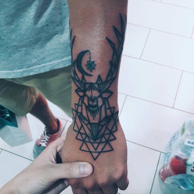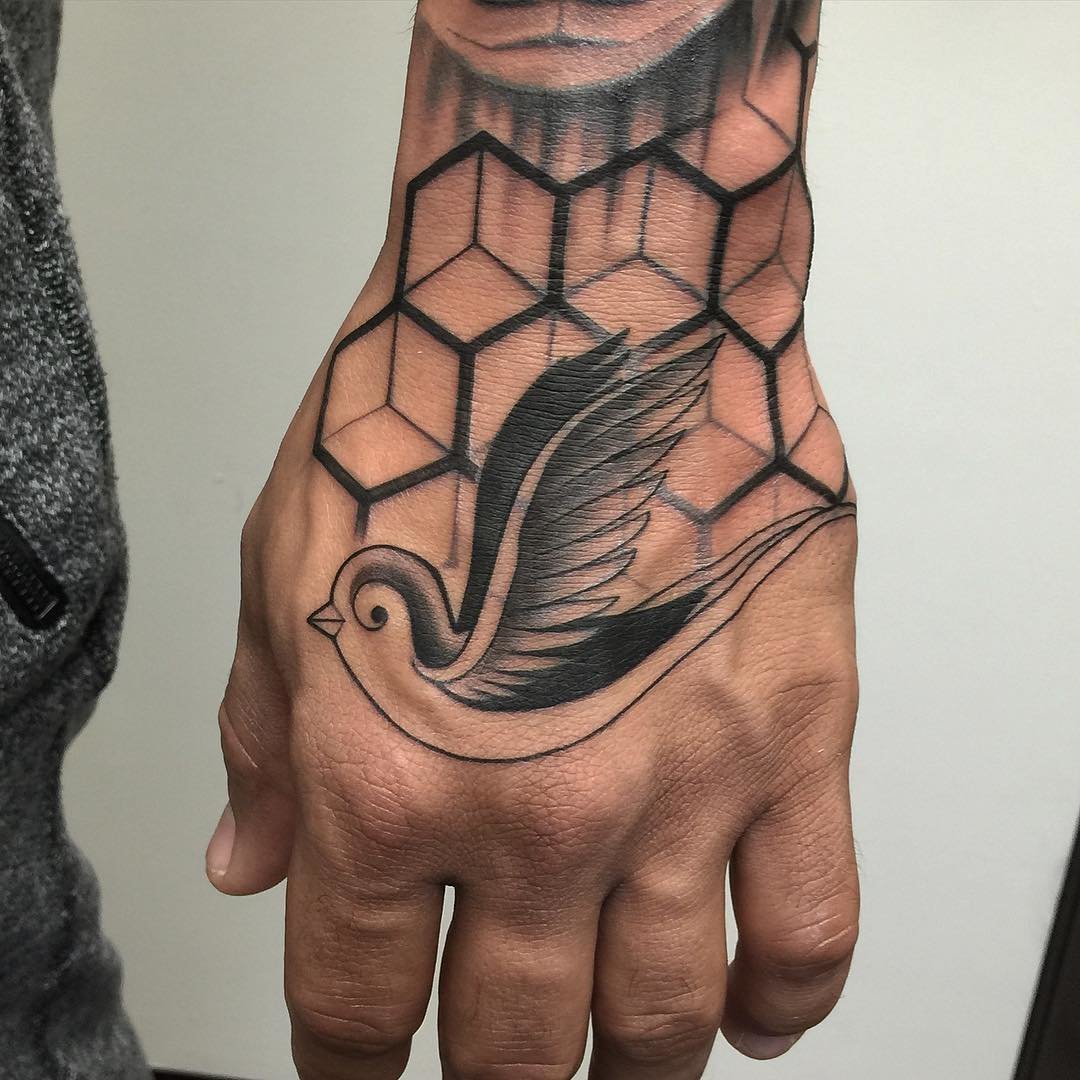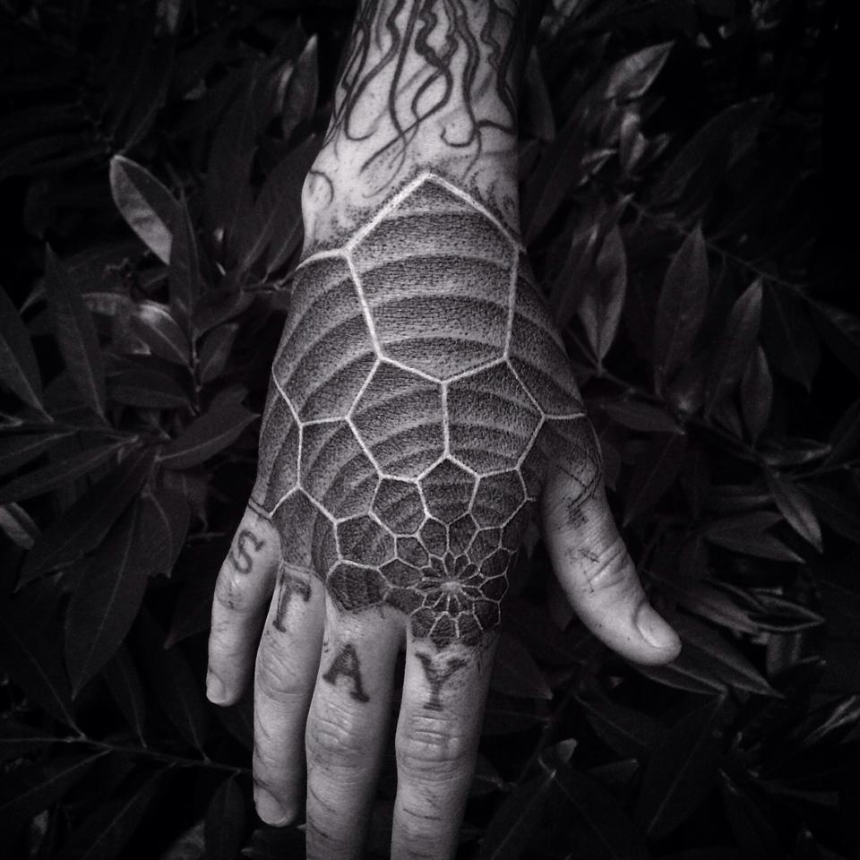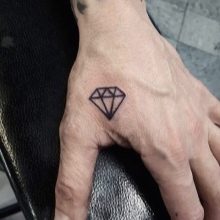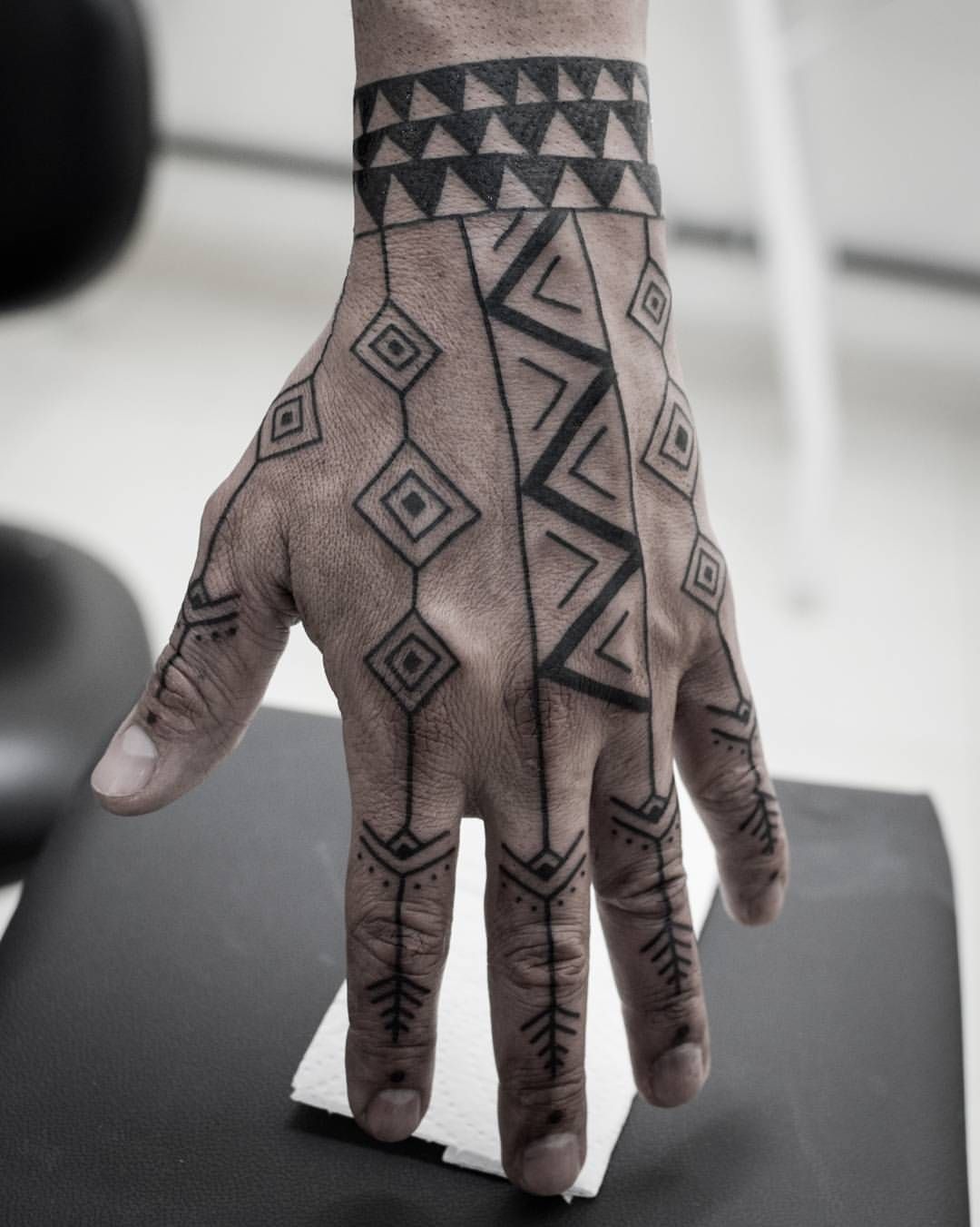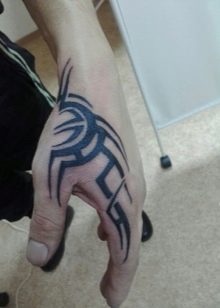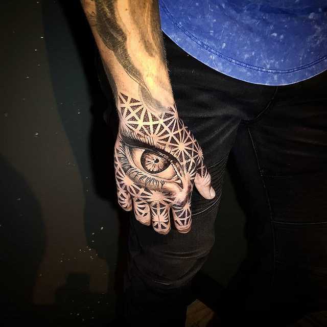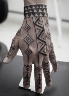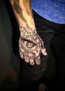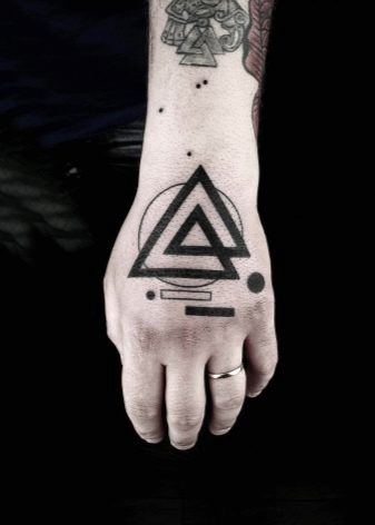- Geometrie. Für ein Tattoo auf der Hand ist diese Stilrichtung perfekt. Gewöhnlich bestehen geometrische Kompositionen aus kleinen Figuren, die zu einer Zeichnung zusammengefasst sind. Meistens wird schwarze Tinte verwendet, um ziemlich komplexe Bilder zu bilden, die sehr lebendige visuelle Motive erzeugen.