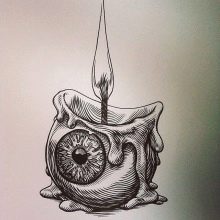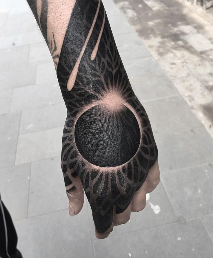 - Muster mit dunklem Fokus. Durch ein solches Tattoo kann ein Mann seine eigene Geisteskraft und seinen soliden Charakter betonen.