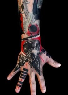 - Oft gibt es Situationen, in denen die Farben auf den Händen verzerrt sind. Zum Beispiel gibt schwarze Farbe Blau ab, Farbe beginnt in Stücke zu fallen. Dies liegt daran, dass die Hände einer Person immer an der Arbeit beteiligt sind, die Handflächen gequetscht und gelöst werden, weshalb das Tattoo nicht in der erforderlichen Ruhe bleiben kann. Dies führt dazu, dass die Farbe nicht normal Wurzeln schlagen kann.