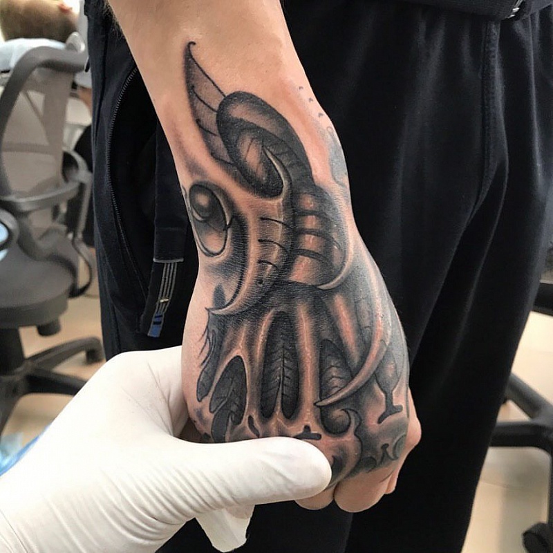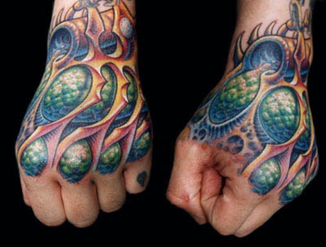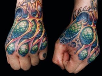 - Bioorganik. Ein sehr interessanter Stil, der als populäre Biomechanik kategorisiert werden kann. Die fragliche Richtung zeichnet sich durch eine dichte und ziemlich saftige Farbe, die Verwendung reichhaltiger Paletten und die sorgfältige Verarbeitung jedes Details aus. Das Zeichnen im Stil der Bioorganik, auf die Hand aufgetragen, wird von anderen sicherlich nicht unbemerkt bleiben.