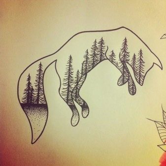 - Negativer Raum. Bilder, die in diesem Sinne umgesetzt werden, erzeugen eine starke visuelle Wirkung. In Kompositionen spielt der Raum um das Motiv die gleiche wichtige Rolle wie das Hauptmotiv selbst. Das dominierende Element in den betrachteten Tattoos ist schwarze Tinte.