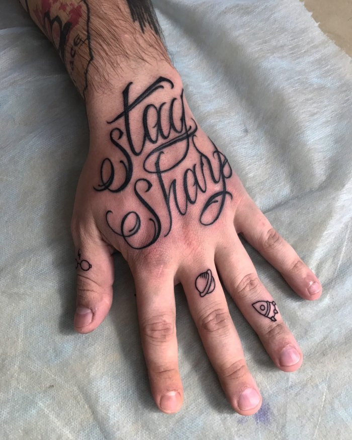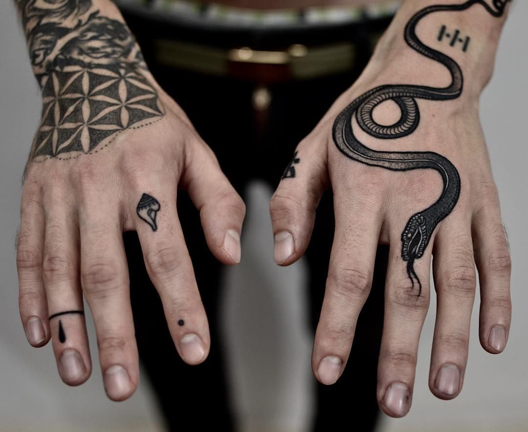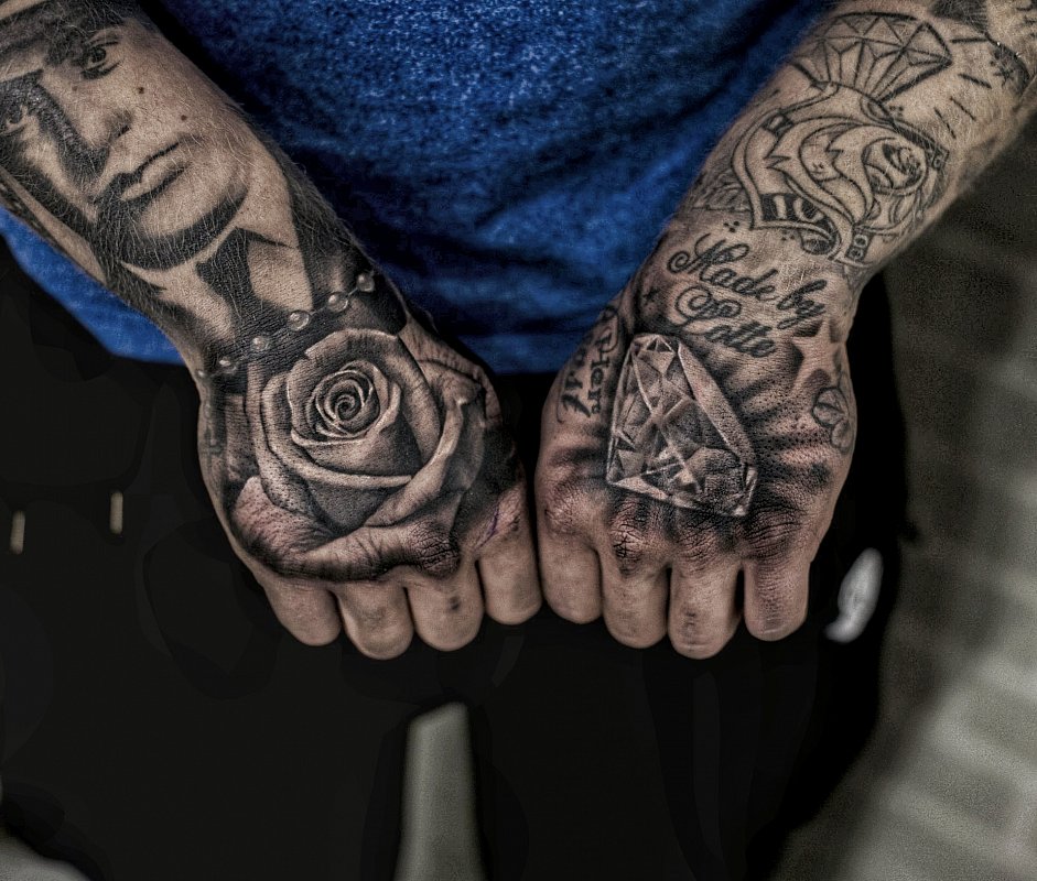 - Jeder Tätowierer weiß, dass es Bereiche gibt, in denen es besonders schwierig ist, sich tätowieren zu lassen. Zu diesen Stellen gehören die Hände. Bei Arbeiten in solchen Bereichen muss eine Fachkraft äußerste Sorgfalt und Vorsicht walten lassen und mit höchster Präzision handeln.