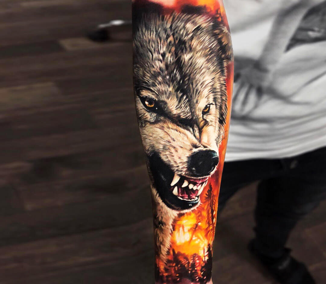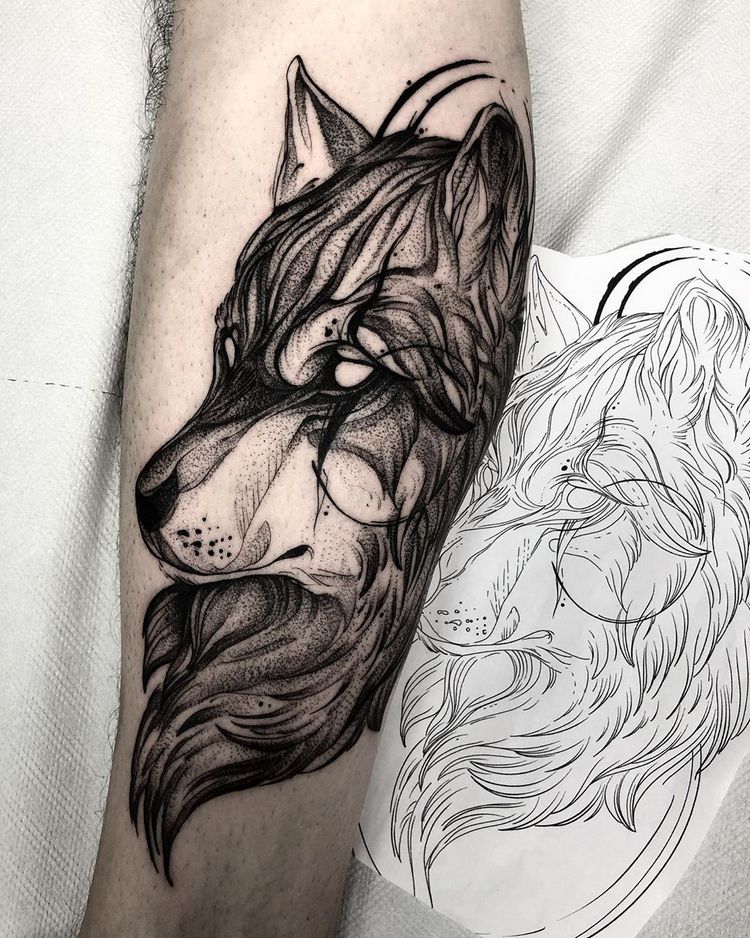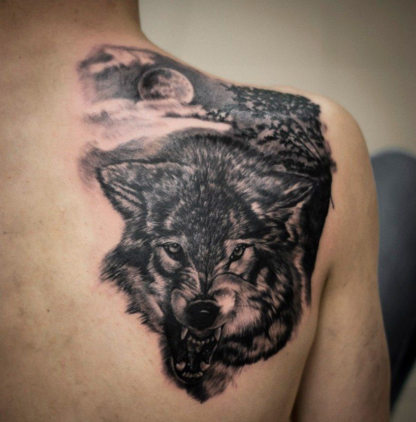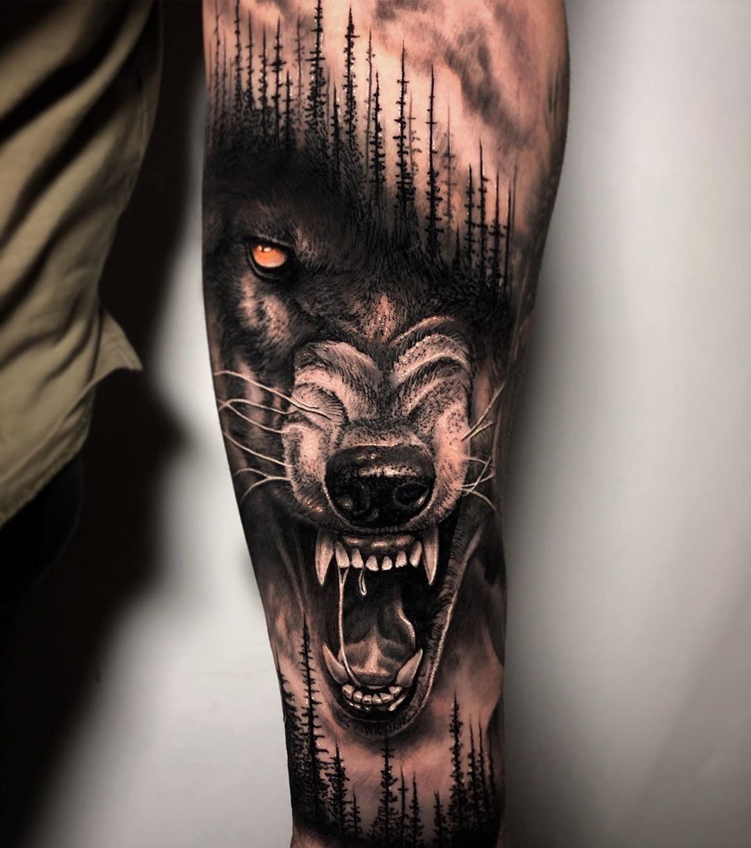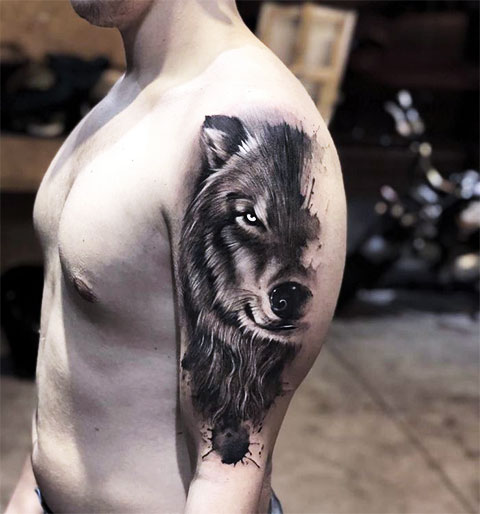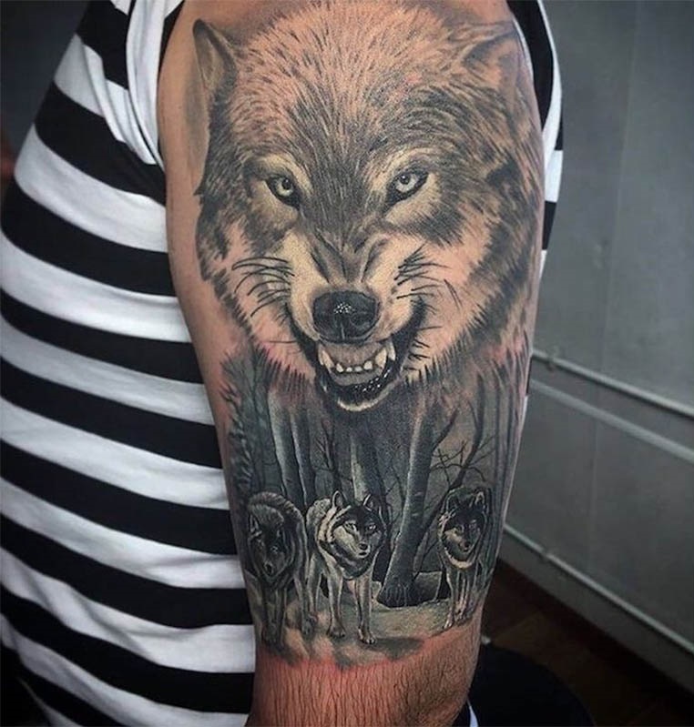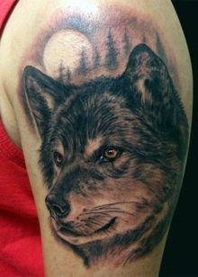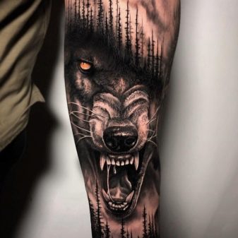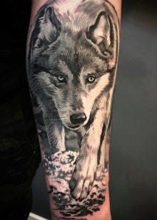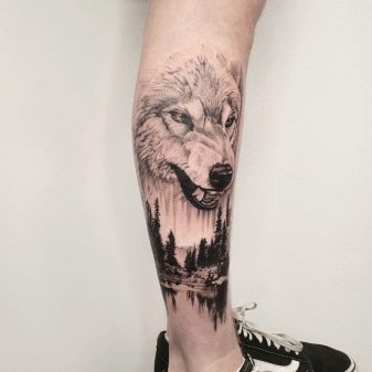 Der realistische Wolf ist in Farbe und Schwarzweiß erhältlich. Gleichzeitig wird das Farbmuster im Gegensatz zu Frauentattoos mit gedeckten Farben gefüllt.