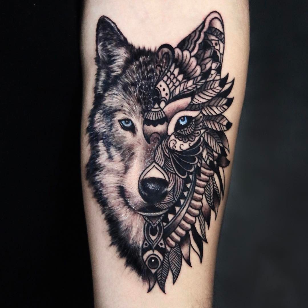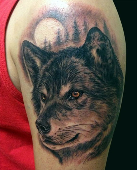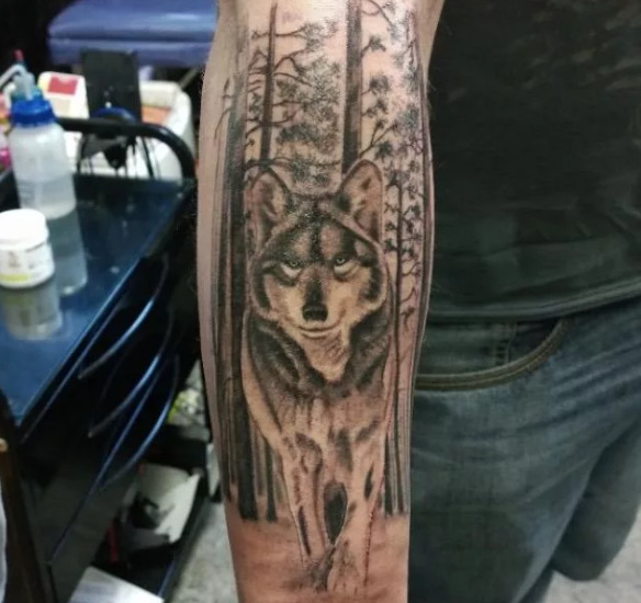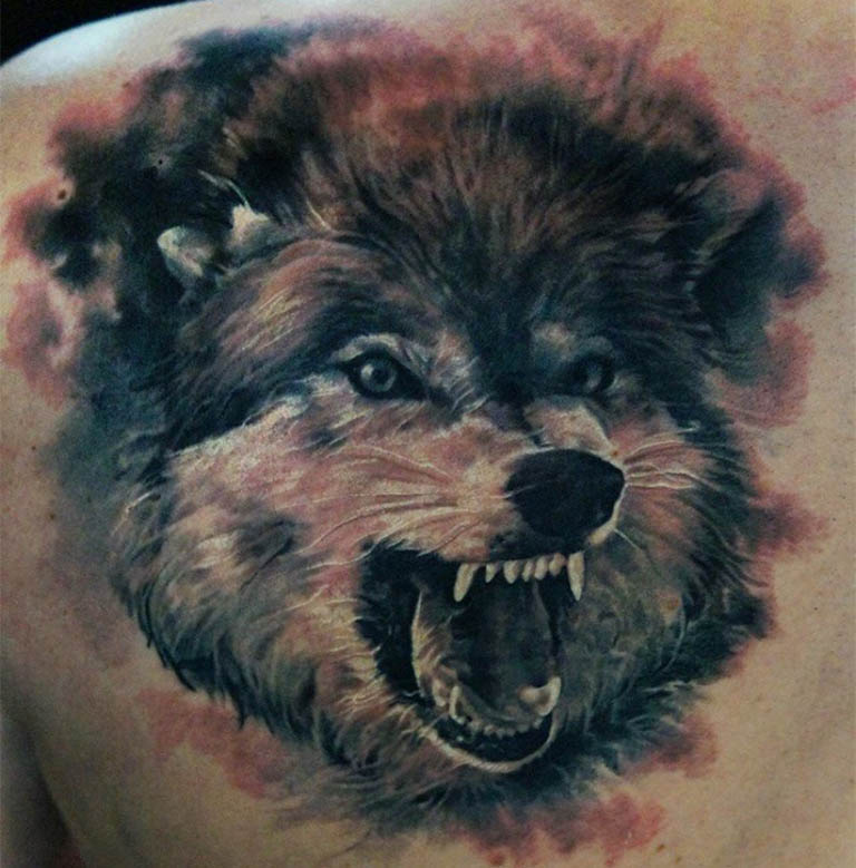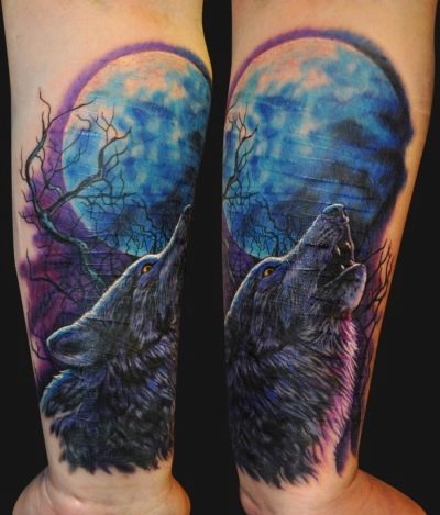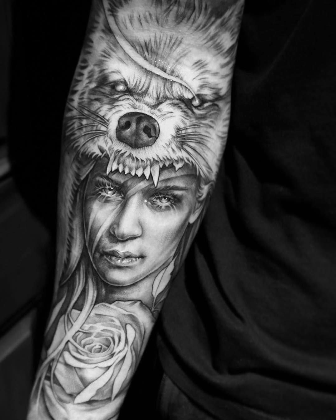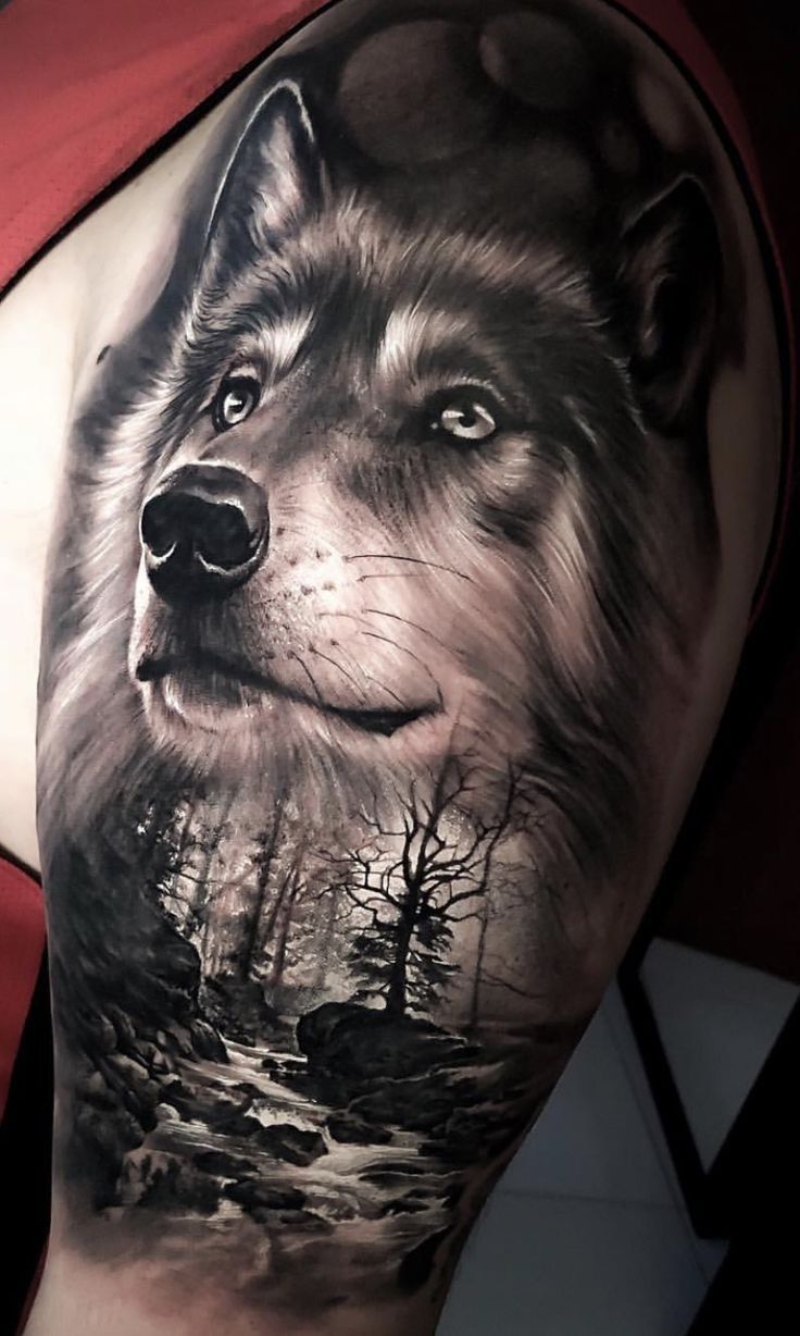 Der realistische Wolf ist in Farbe und Schwarzweiß erhältlich. Gleichzeitig wird das Farbmuster im Gegensatz zu Frauentattoos mit gedeckten Farben gefüllt.