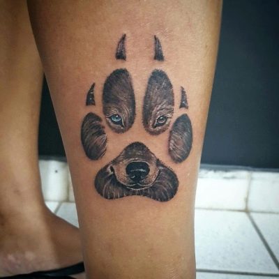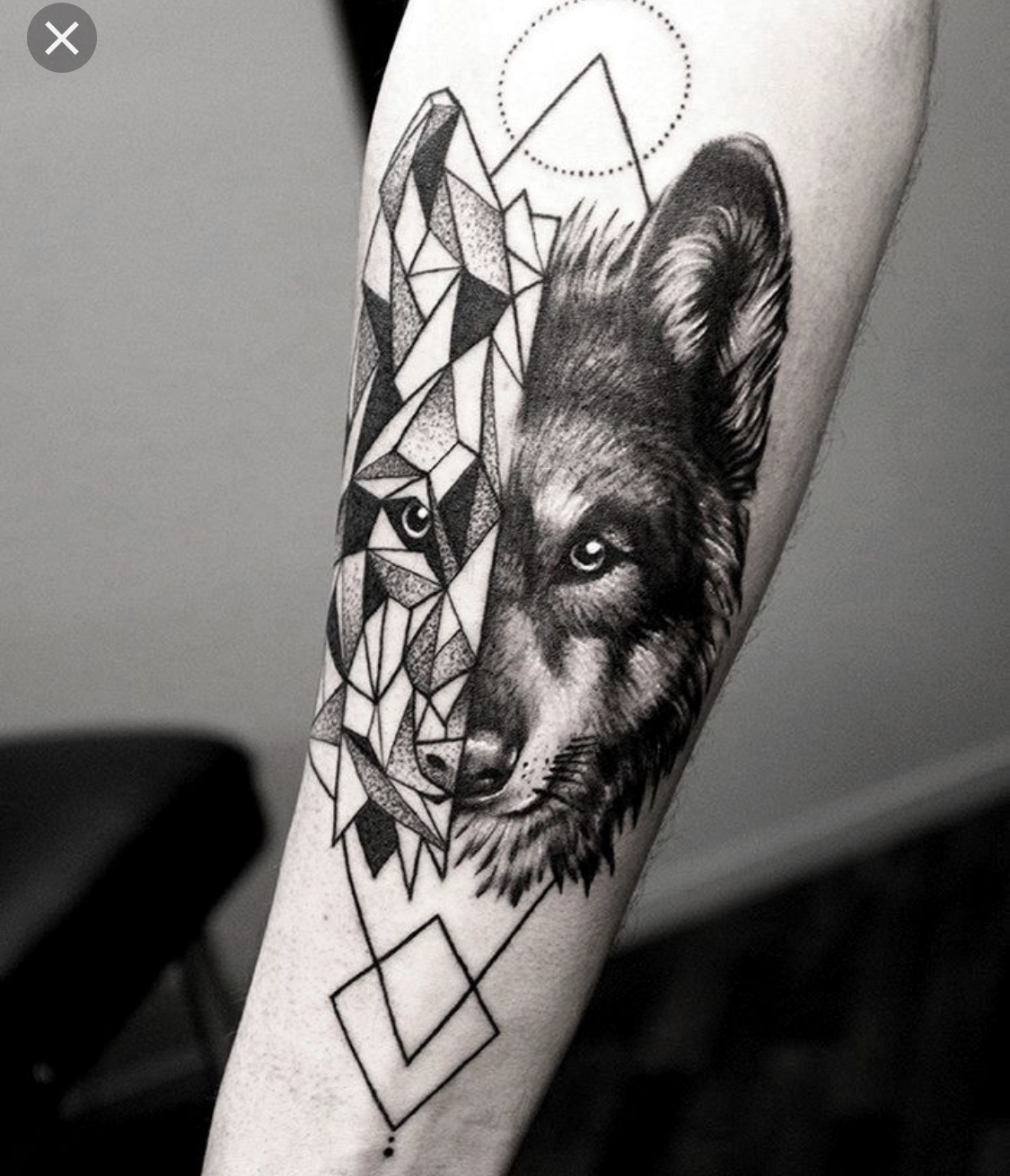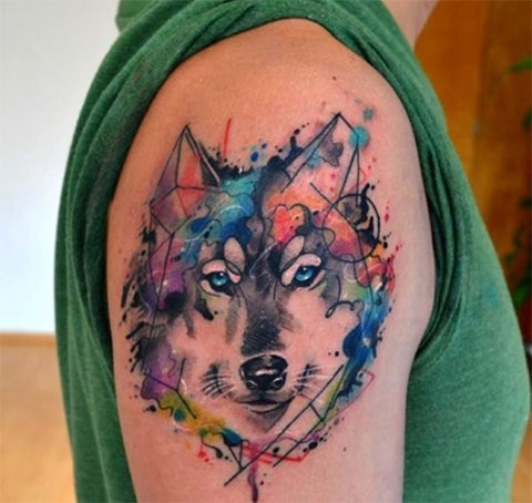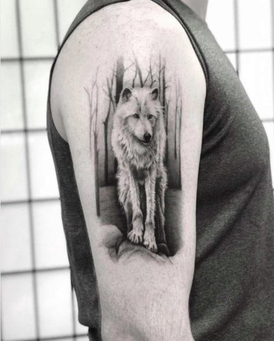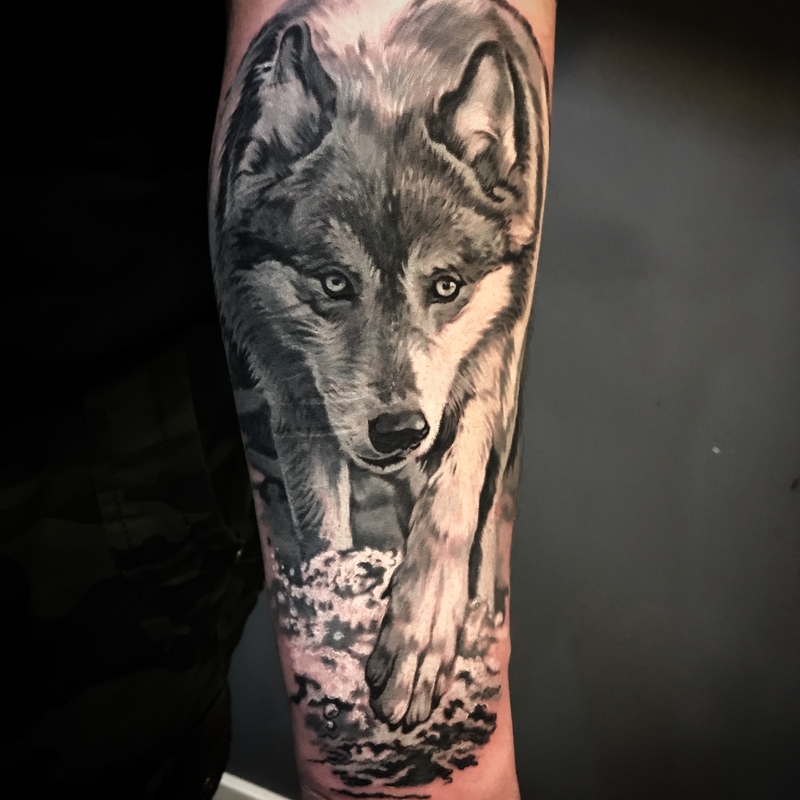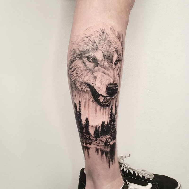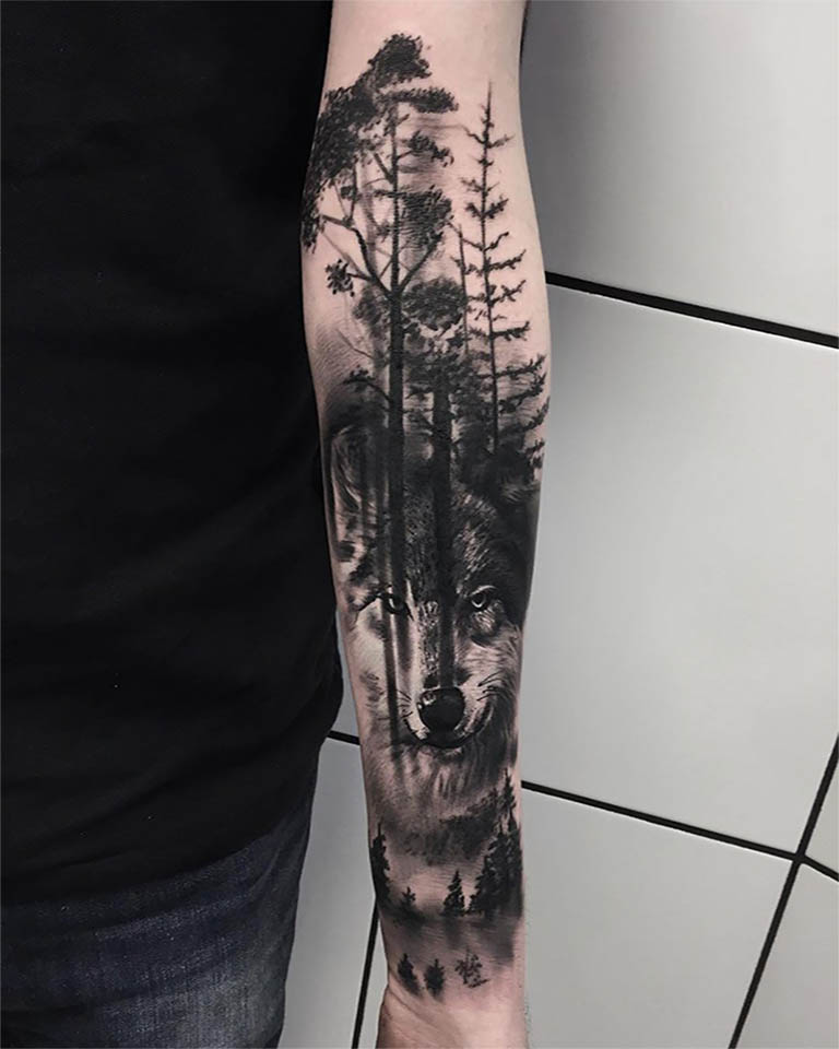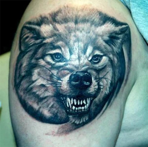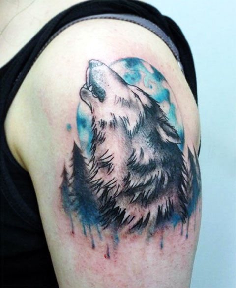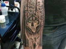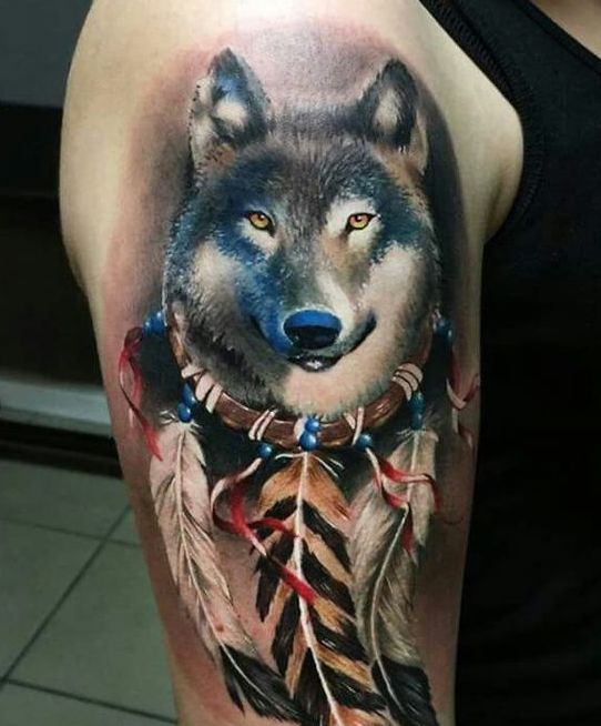 Der realistische Wolf ist in Farbe und Schwarzweiß erhältlich. Gleichzeitig wird das Farbmuster im Gegensatz zu Frauentattoos mit gedeckten Farben gefüllt.