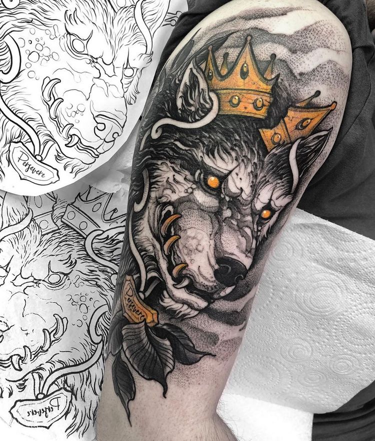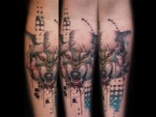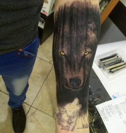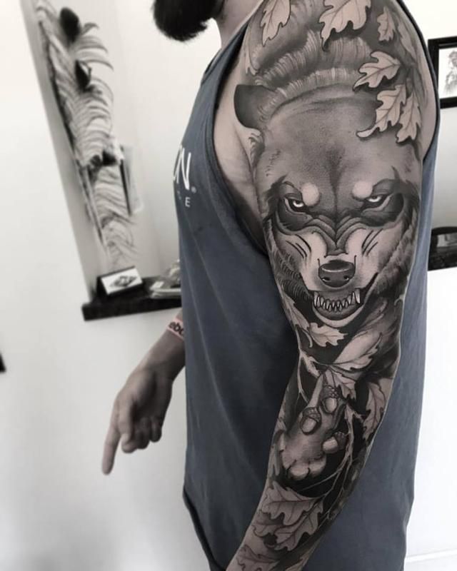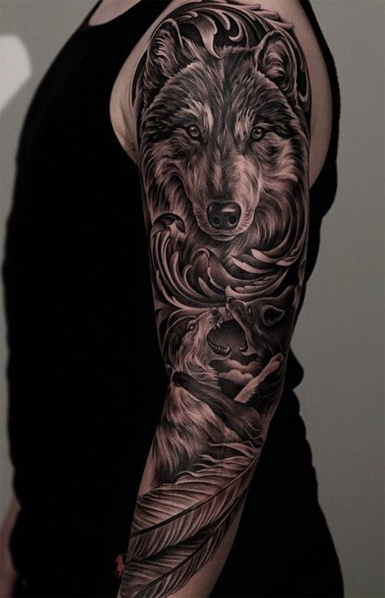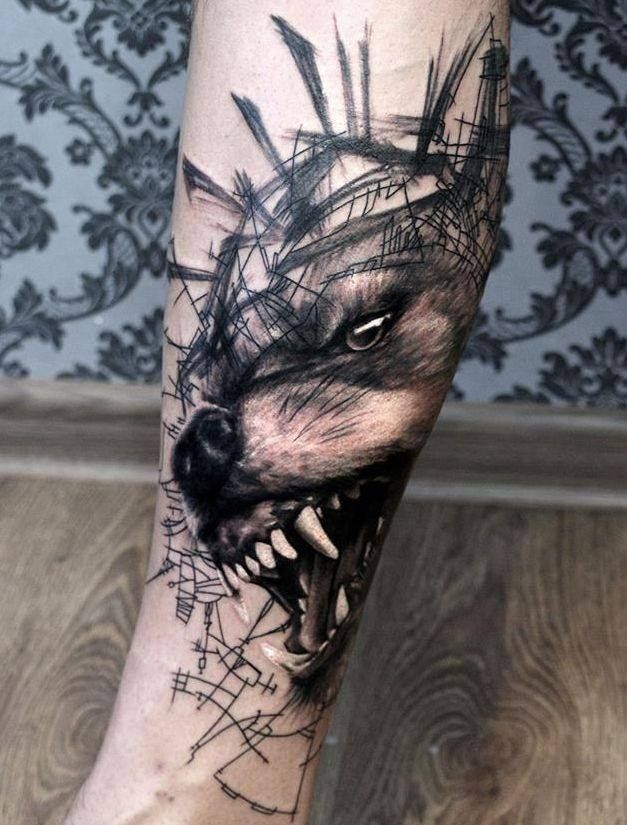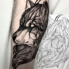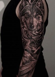 Der Wolf sieht in der "Ärmel" -Technik spektakulär aus und umschließt den Arm wie Kleidung. Diese Art von Tätowierung zeichnet sich durch eine dichte Polsterung um den Arm aus. In diesem Fall ist die Länge der "Hülse" unterschiedlich.