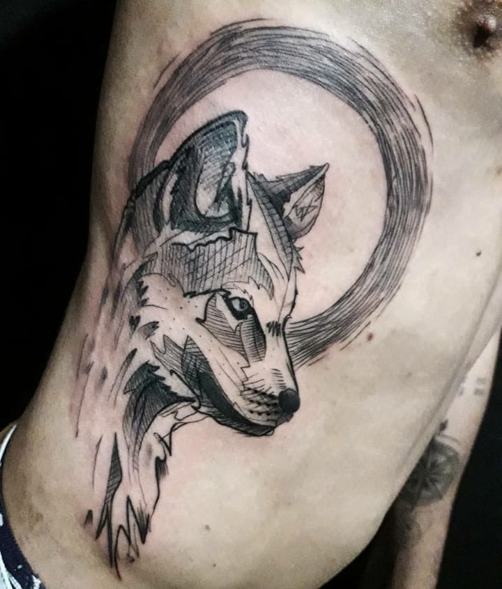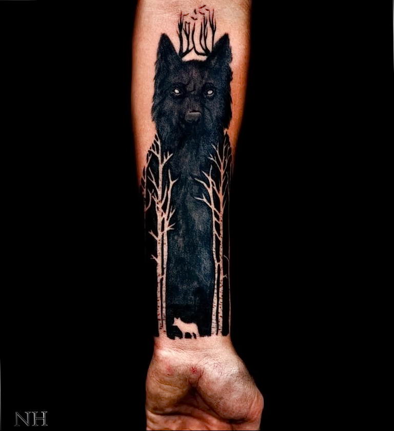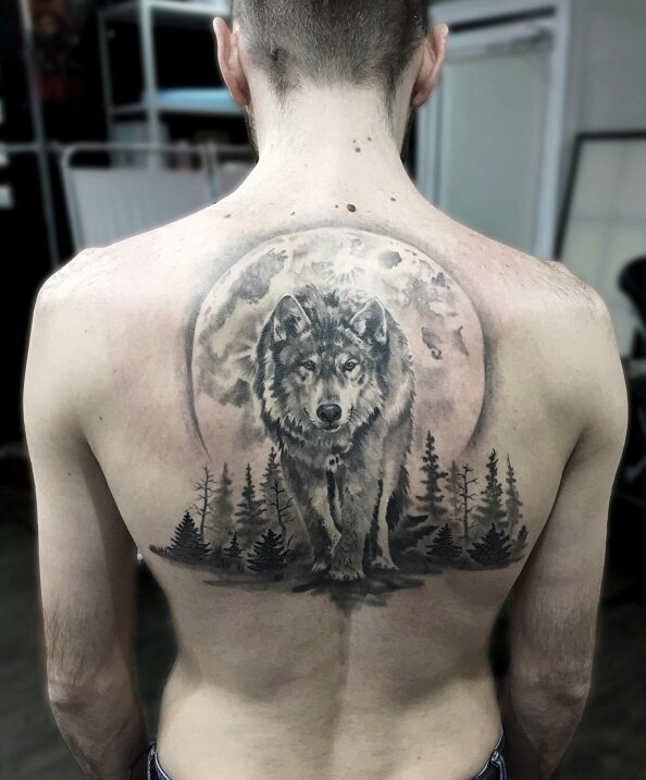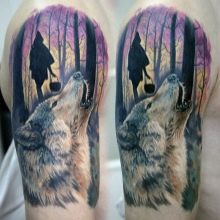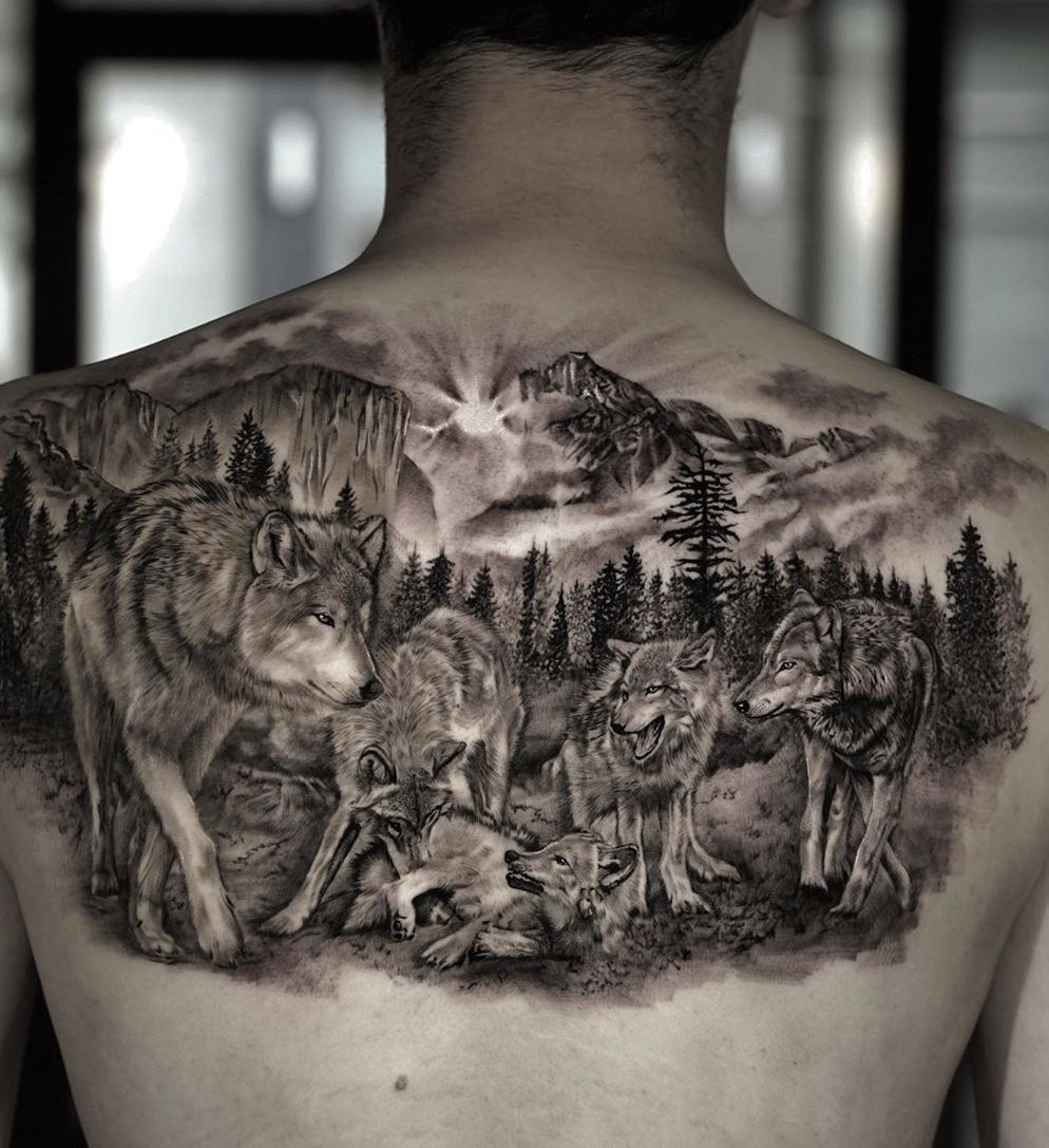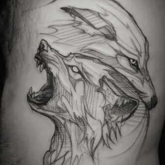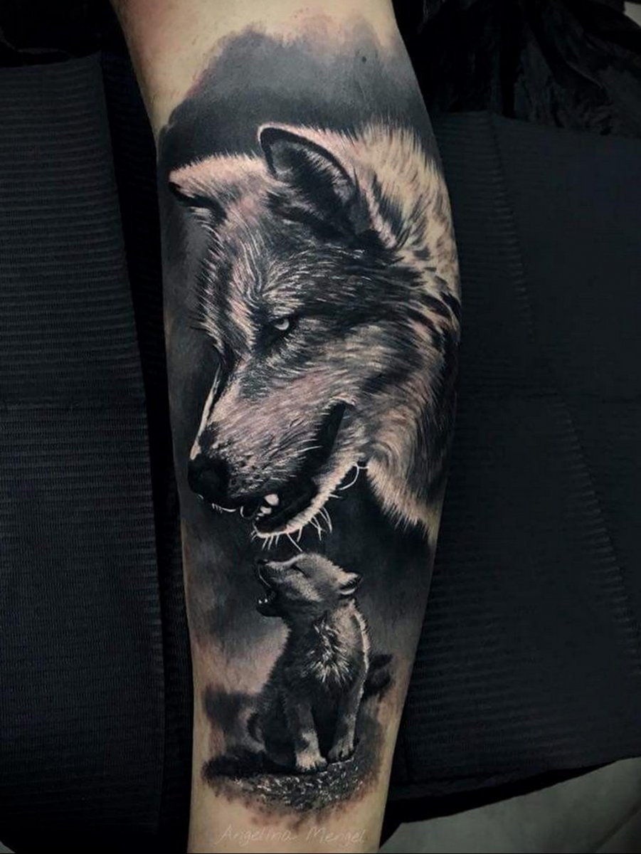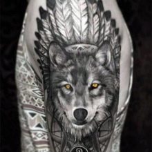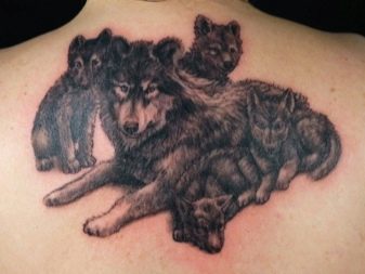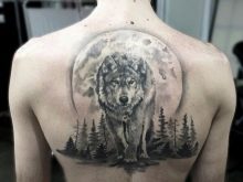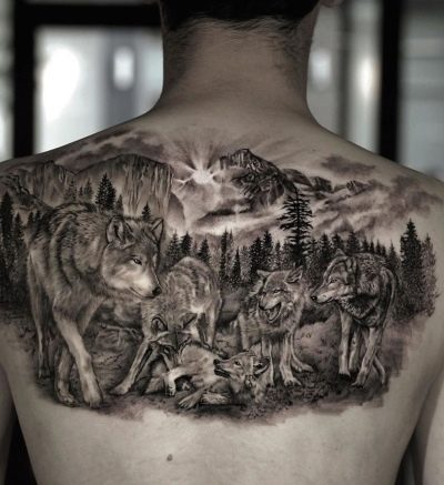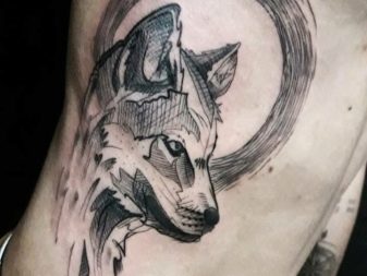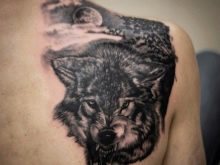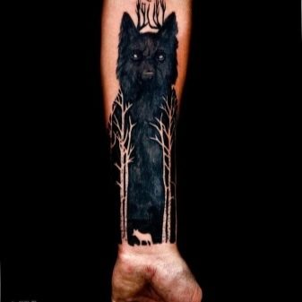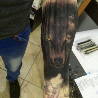 Beliebte Ideen sind ein Wolf und ein Rabe, ein Biest mit einer Wölfin. Darüber hinaus kann auf dem Körper ein Wolfsrudel vor dem Hintergrund von Bergen und einem See, ein schleichendes oder im Hinterhalt lauerndes Tier dargestellt werden.