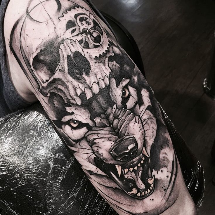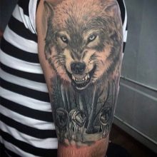 - Wolf mit Schädel - eine dramatische Version einer Tätowierung mit Bedeutung, die auf die Bereitschaft hinweist, sich dem Tod zu stellen.