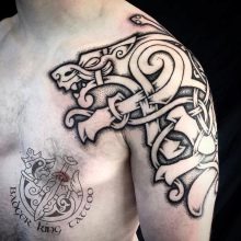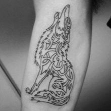Es schließt sich und symbolisiert die Unendlichkeit. Ein Tattoo mit einem keltischen Wolf symbolisiert die Einheit mit der Natur und der umgebenden Welt. Der Kopf des Tieres ähnelt einem Drachen, der die komplizierten Feinheiten von Knoten krönt.