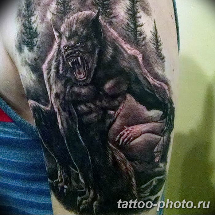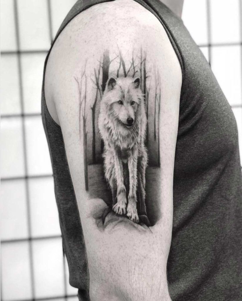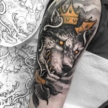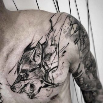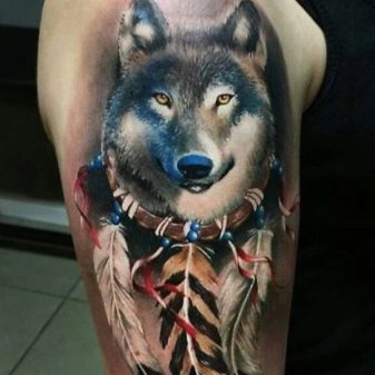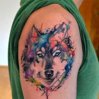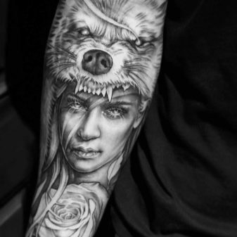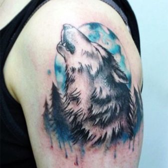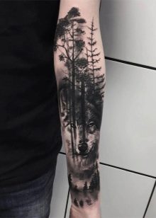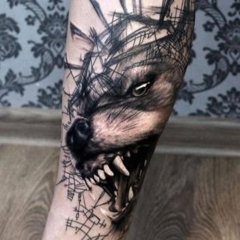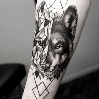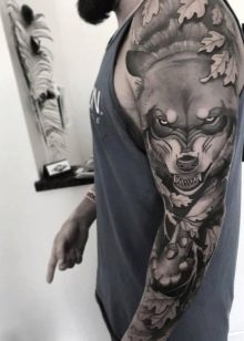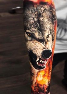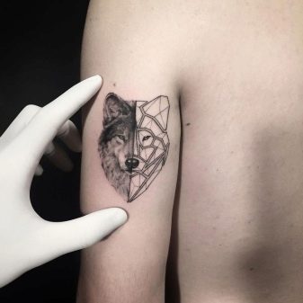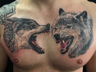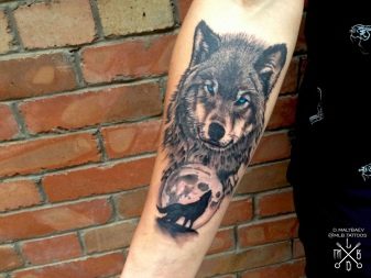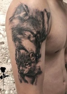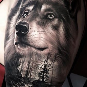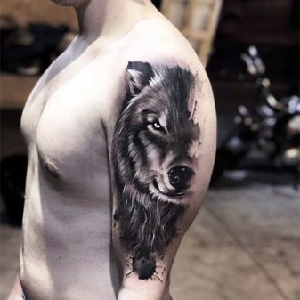Moderne Männer versuchen, Tätowierungen auf geprägten Körperstellen aufzubringen. Dadurch wirkt die Zeichnung voluminöser und glaubwürdiger. Dies gilt insbesondere für Wölfe, die im Stil des Realismus ausgestopft sind. Auf Schulter und Unterarm aufgetragen, erwachen sie buchstäblich bei jeder Bewegung der Muskulatur zum Leben.
