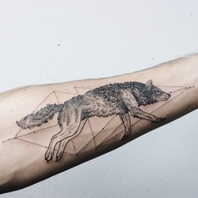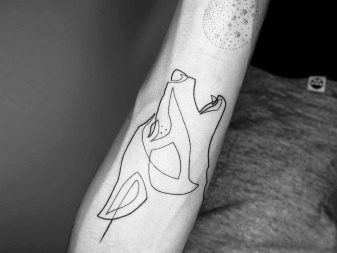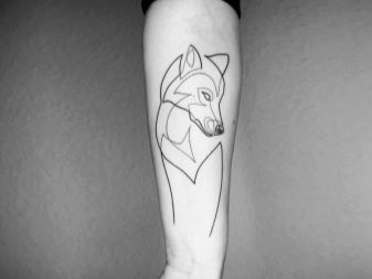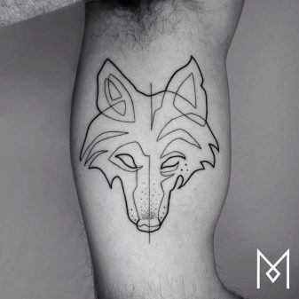 Sie können als einzelne Linie gesetzt werden, kombiniert mit geometrischen Formen, zusätzliche Arbeit. Der minimalistische Wolf ist anmutig, lakonisch, aber erkennbar. Es kann als Silhouette eines laufenden Tieres dargestellt werden.
