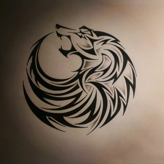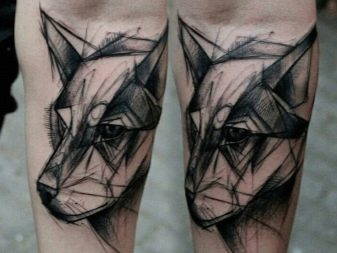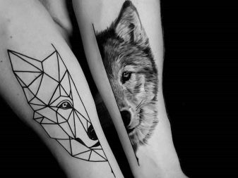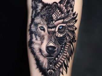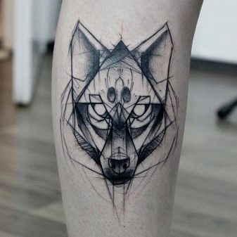 Auch die Portrait-Optionen sind unterschiedlich. In einem Fall ist es das Gesicht eines wütenden Wolfes. In der anderen - Stilisierung, bei der eine Seite der Schnauze realistisch gezeichnet ist und die andere - in Form von geometrischen Formen oder Ornamenten.