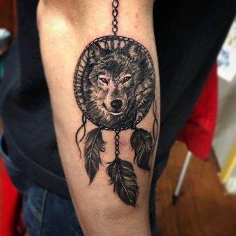 Der Wolf in Form eines Traumfängers ist eine originelle Handlung. Darüber hinaus kann der Kern des Talismans ein gewöhnliches, stilisiertes, heulendes Tier sein. Auch die Art der Füllung unterscheidet sich, was lakonisch und realistisch sein kann.