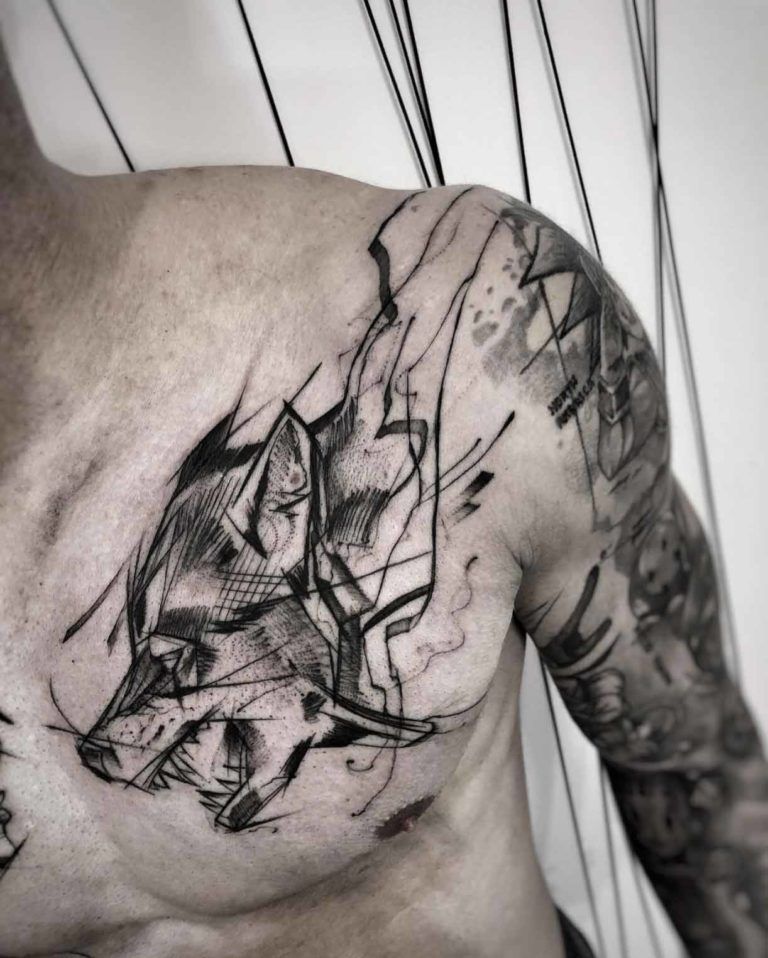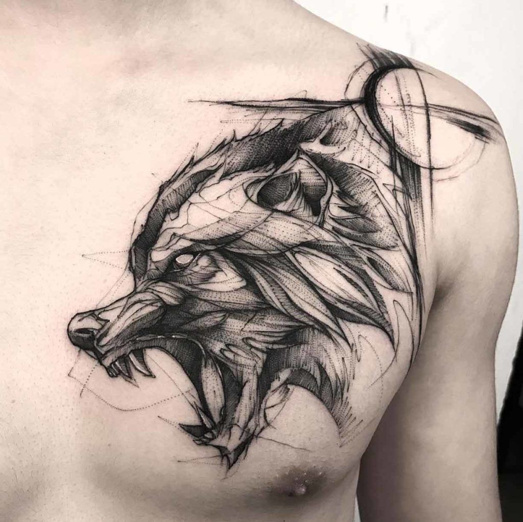 Die Sketch-Stil-Technik ist ein einzigartiger Tattoo-Stil für Männer. Es ist schwarz gefüllt, um die unvollständige Wirkung des Bildes zu bewahren. Die Ansicht des Bildes ähnelt einer schematischen Zeichnung.