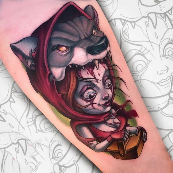 Nicht weniger bunt ist das Bild, bei dem die Schnauze eines Wolfes durch das zerrissene Fleisch lugt. Damit wird die versteckte Natur des Eigentümers demonstriert.