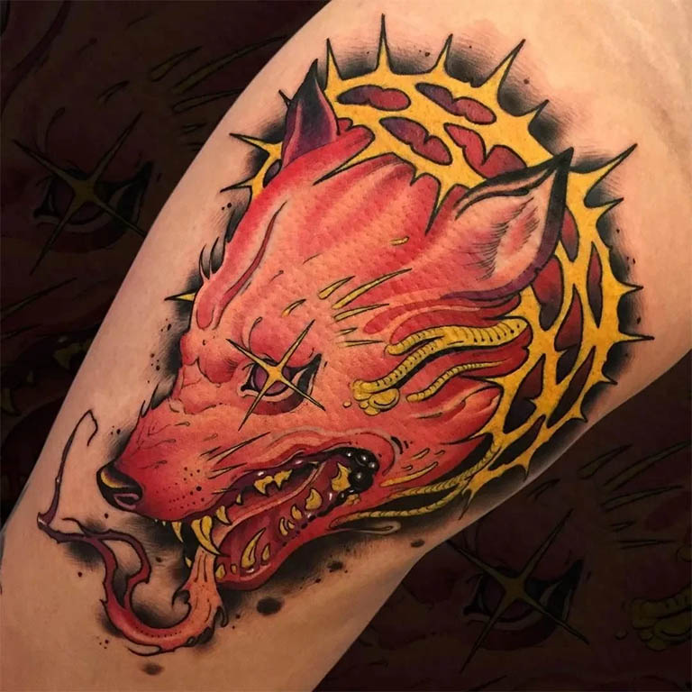 Ein Wolf im Stil der New School kann durch charakteristische Attribute ergänzt werden. Zum Beispiel kann es ein Totenkopf oder eine Art Ornament sein.