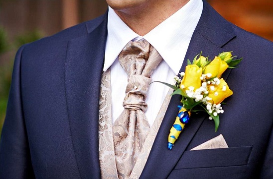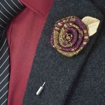 Sie können Broschen für Herren in Juweliergeschäften sehen. mit goldener oder silberner Nadel, an dessen einem Ende befestigt ist kleine Blumeaus ihren Stoffen in leuchtenden Farben (gelb, rot, lila, blau, grün). Diese Option eignet sich gut für festliche Veranstaltungen. Sieht ungewöhnlich aus Broschenleiste, an deren Enden Edelsteine angebracht sindmit Edelmetallen umrahmt.