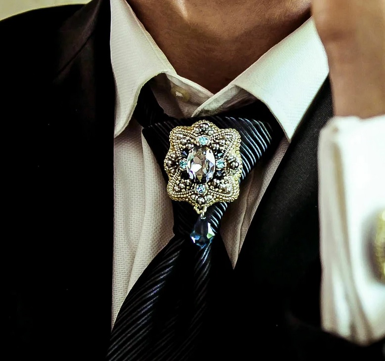 - Krawattenbrosche... Es handelt sich um eine kleine Anstecknadel, die nicht nur als interessante Dekoration dient, sondern auch die Krawatte beim Tragen unterstützt.