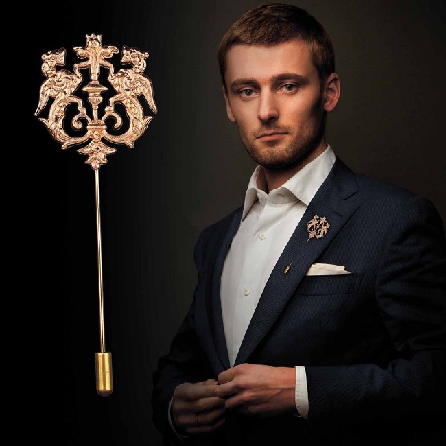 Broschen für Herren können in einer Vielzahl von Stile. Einige Modelle von Broschen-Nadeln haben ein einfaches Design. An beiden Enden sind kleine massive Perlen als Dekoration angebracht. An einem Ende können sie auch ein Ornament in Form eines kleinen goldenen Bildes in Form einer Krone, eines Tieres (Tiger, Elch, Wolf, Löwe, Adler), Inschriften in Form der Initialen des Besitzers (oft so) anfertigen Broschen werden auf Bestellung angefertigt).
