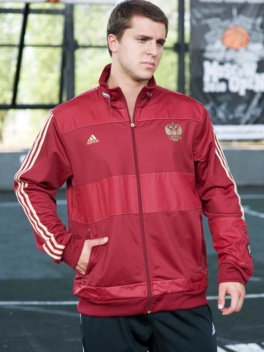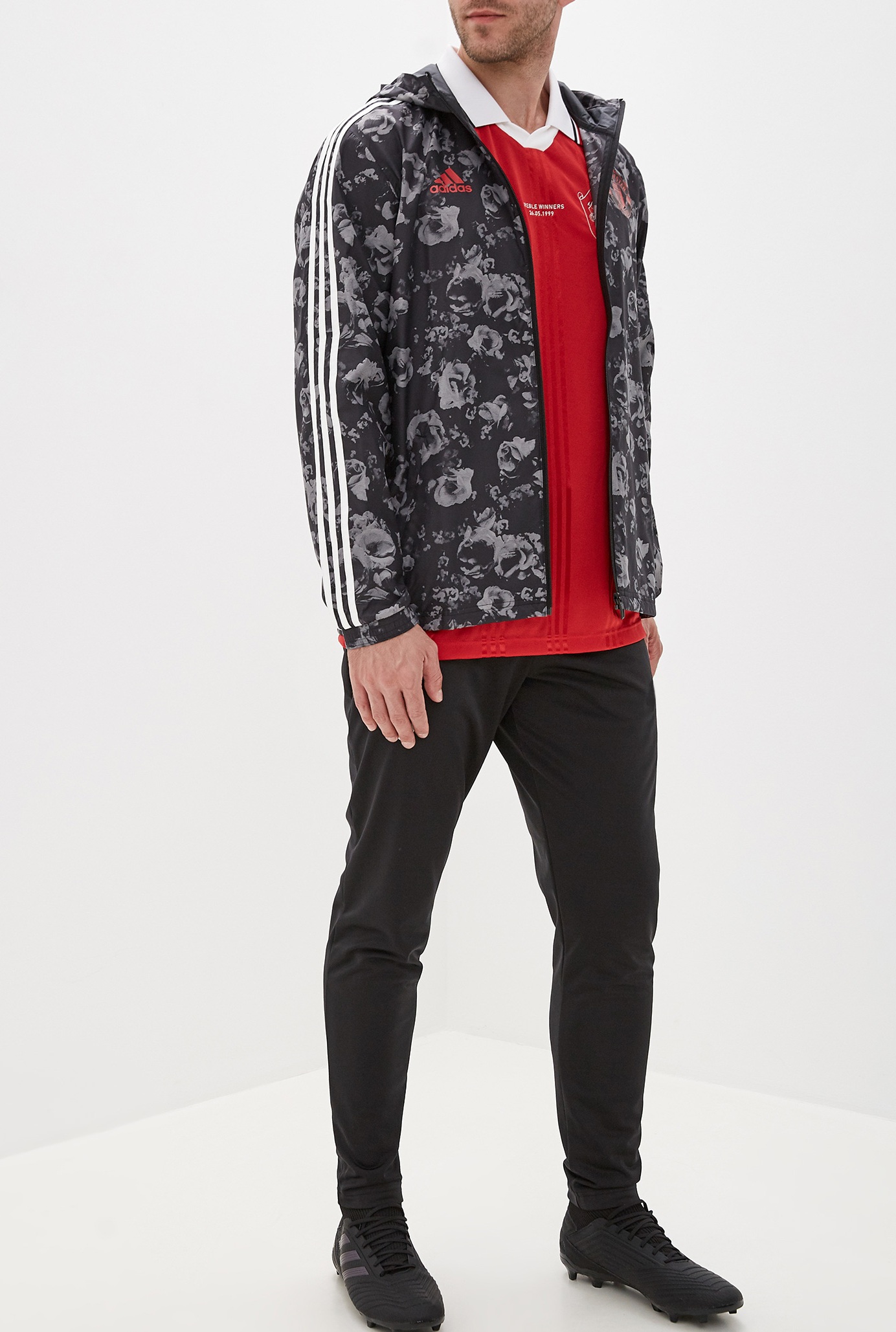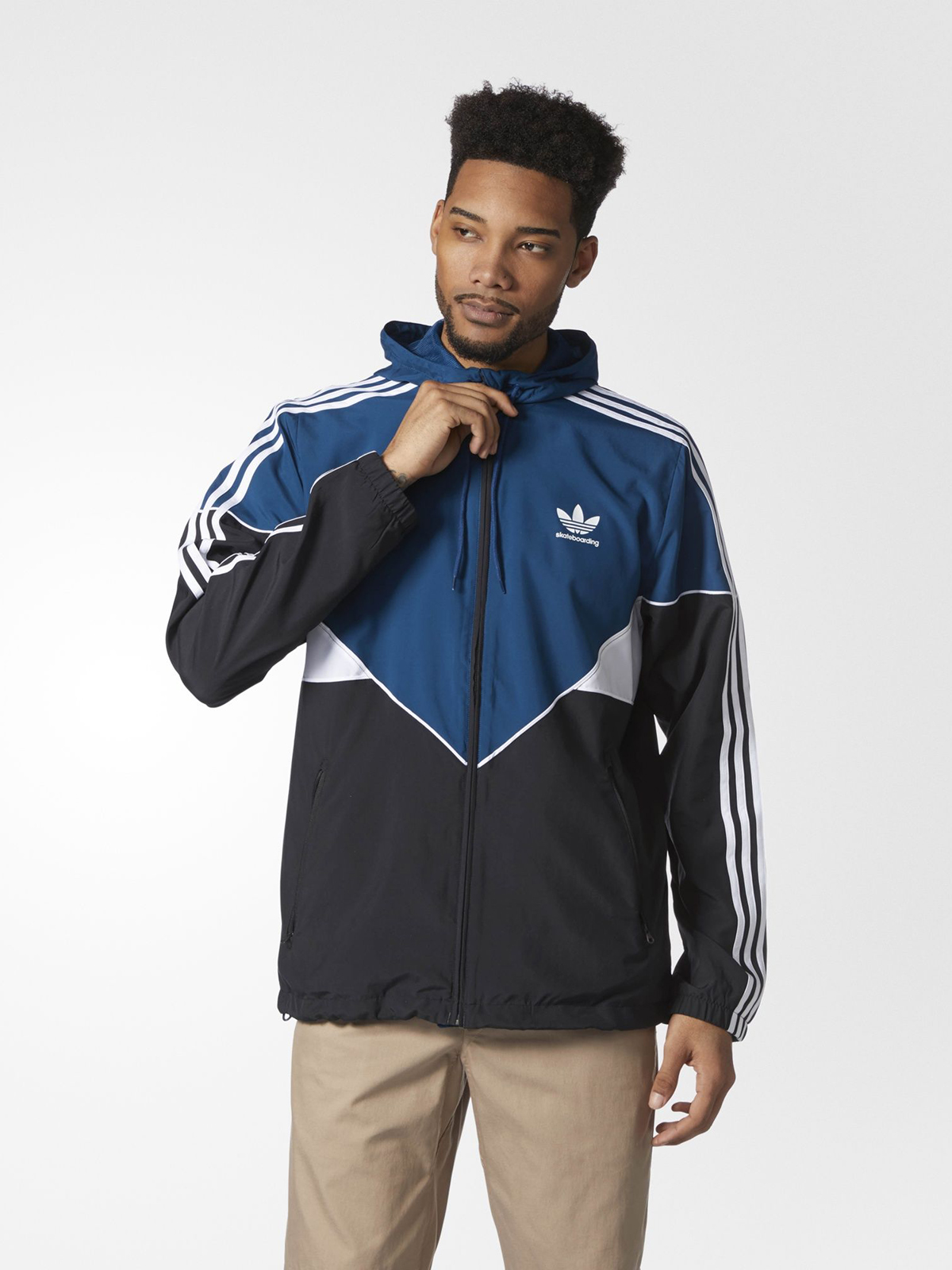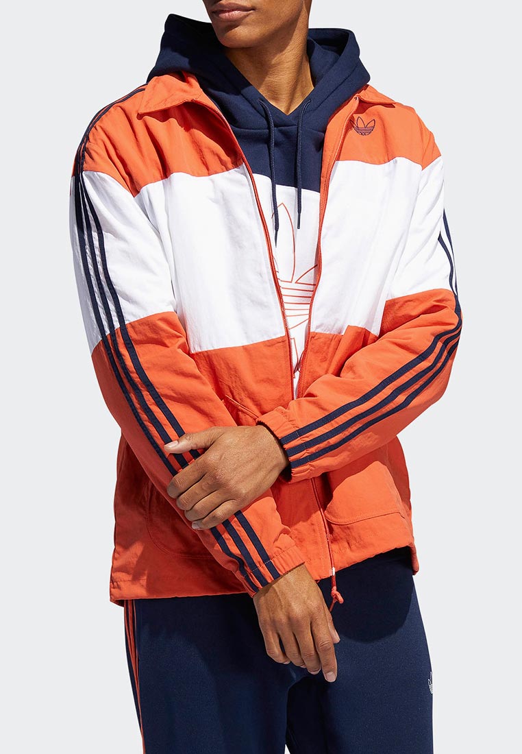 Unter Stadtbedingungen kann der Adidas Sportwindbreaker mit Jogginghose, Jeans, Chino getragen werden. An den Füßen können Turnschuhe, Turnschuhe, Slip-Ons sein.