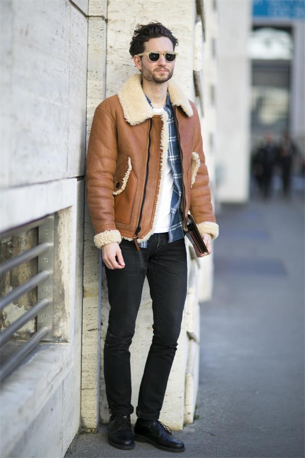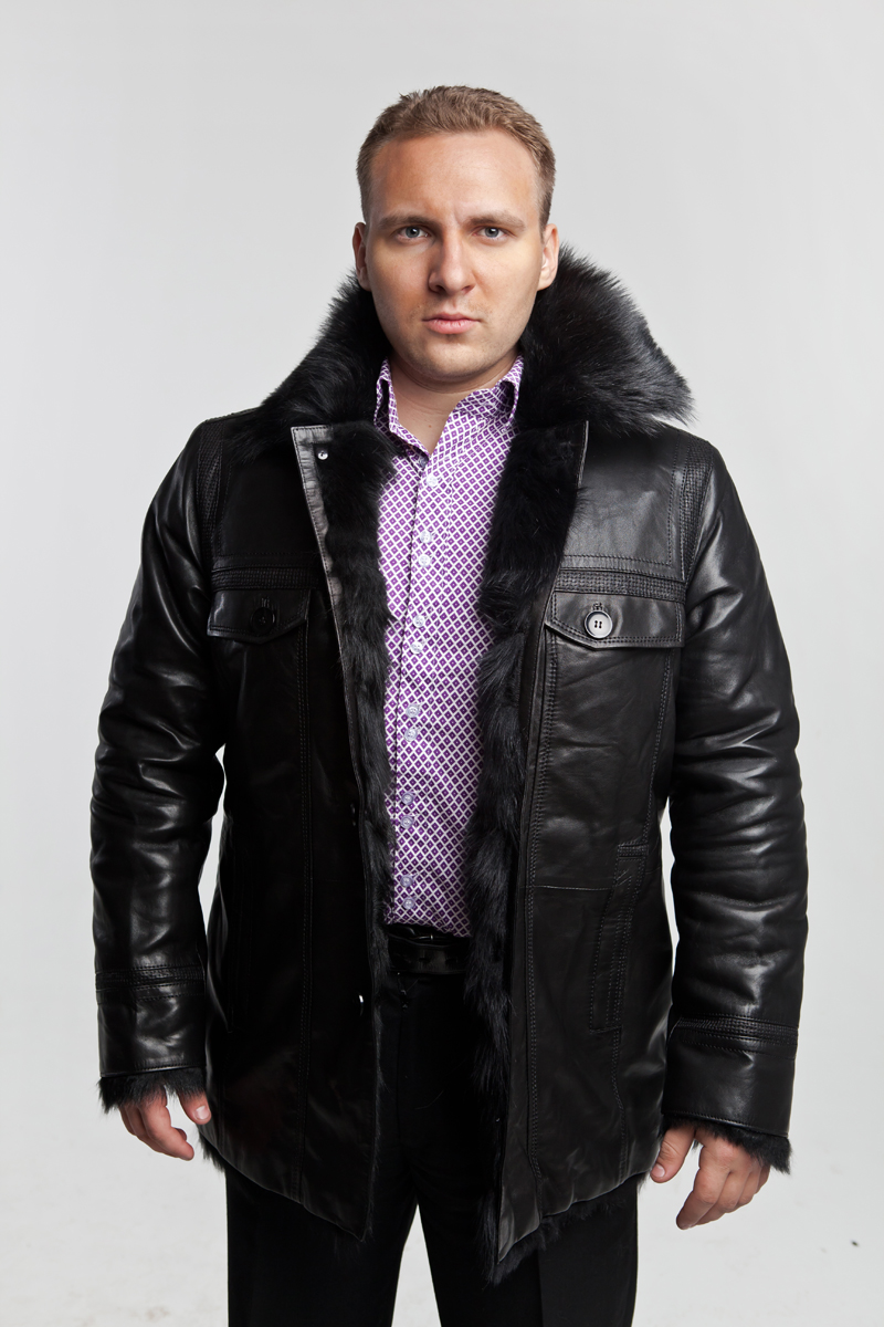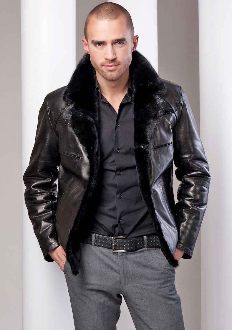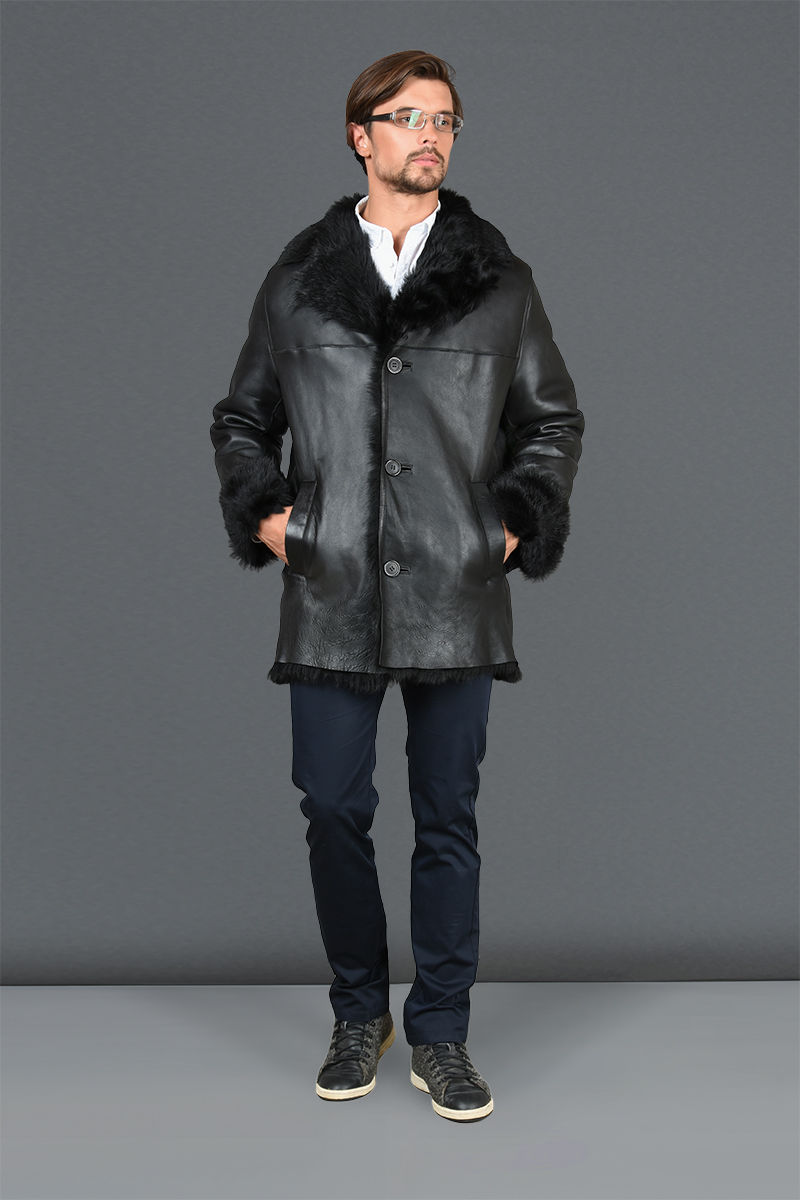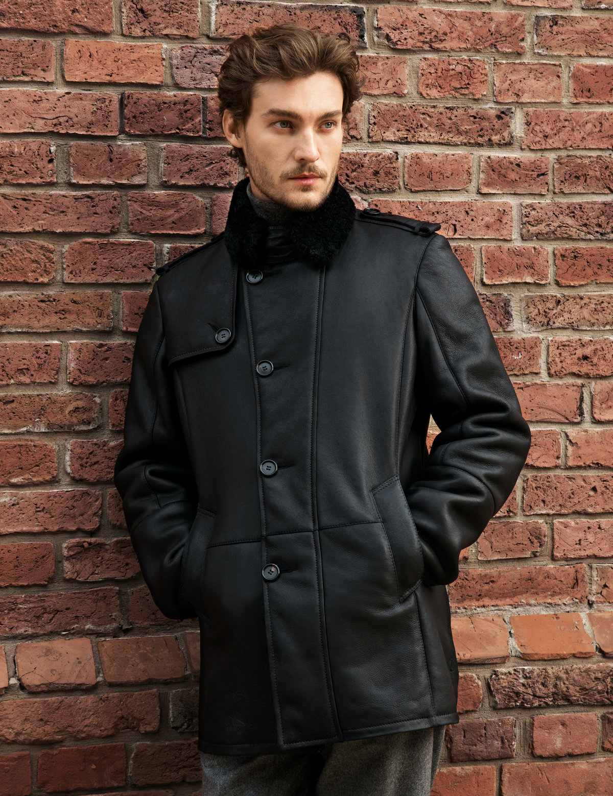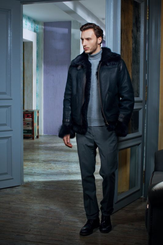 - Dabei kommen die Individualität des Mannes und seine Ausstrahlung deutlich zum Ausdruck. Ein Leder-Lammfellmantel mit schwarzem Fell unterstreicht den klassischen Stil perfekt. Das Hemd ist gelungen auf den Ton der Hose abgestimmt, die dem Übergang vom dunklen Leder des Lammfellmantels zur Stahlfarbe der Hose am ehesten entspricht.