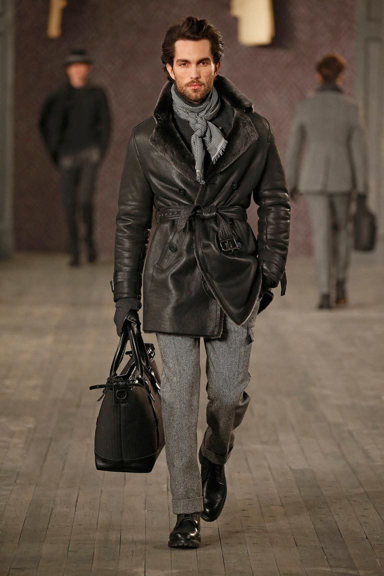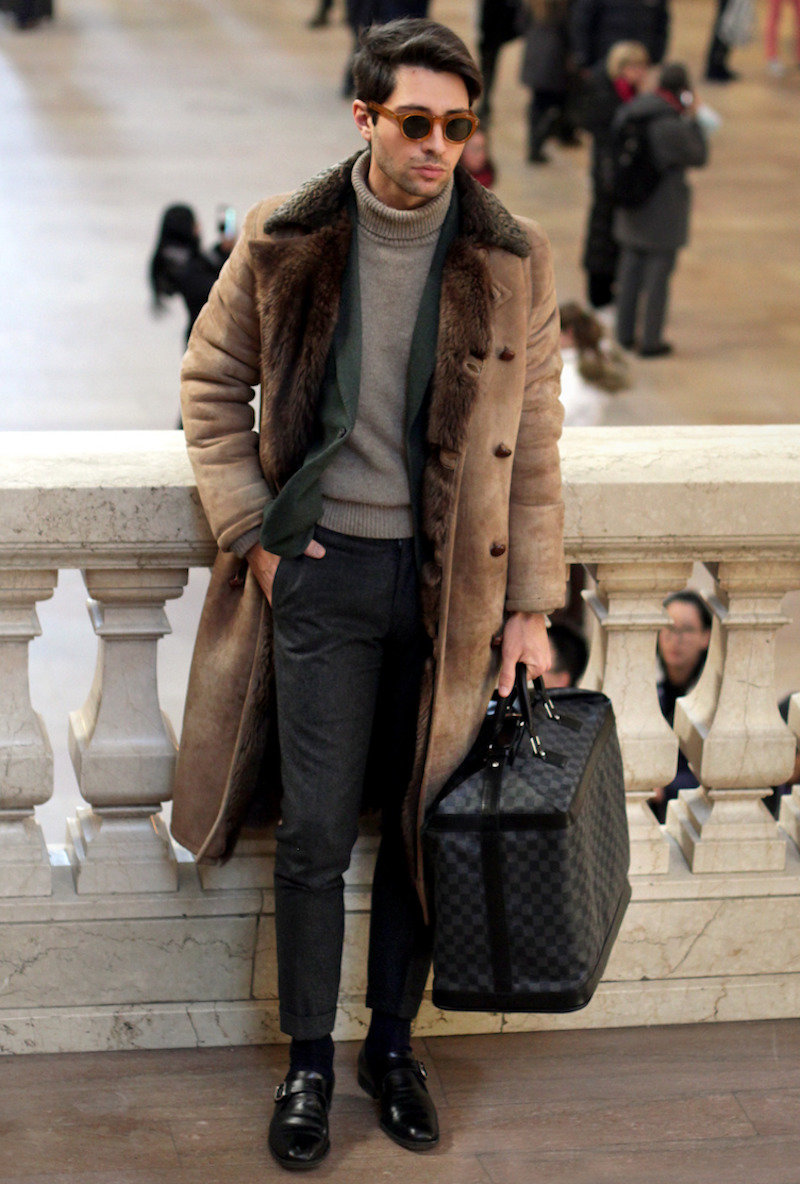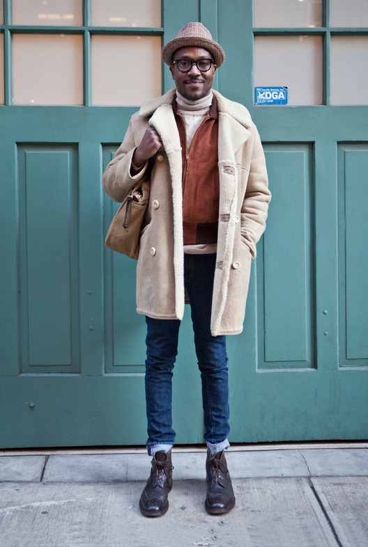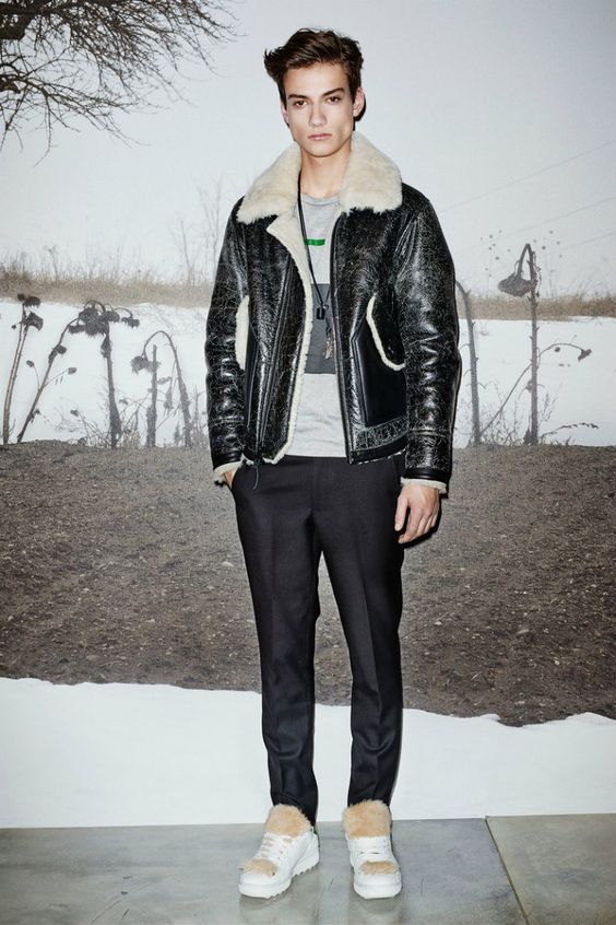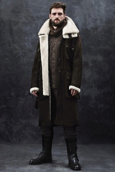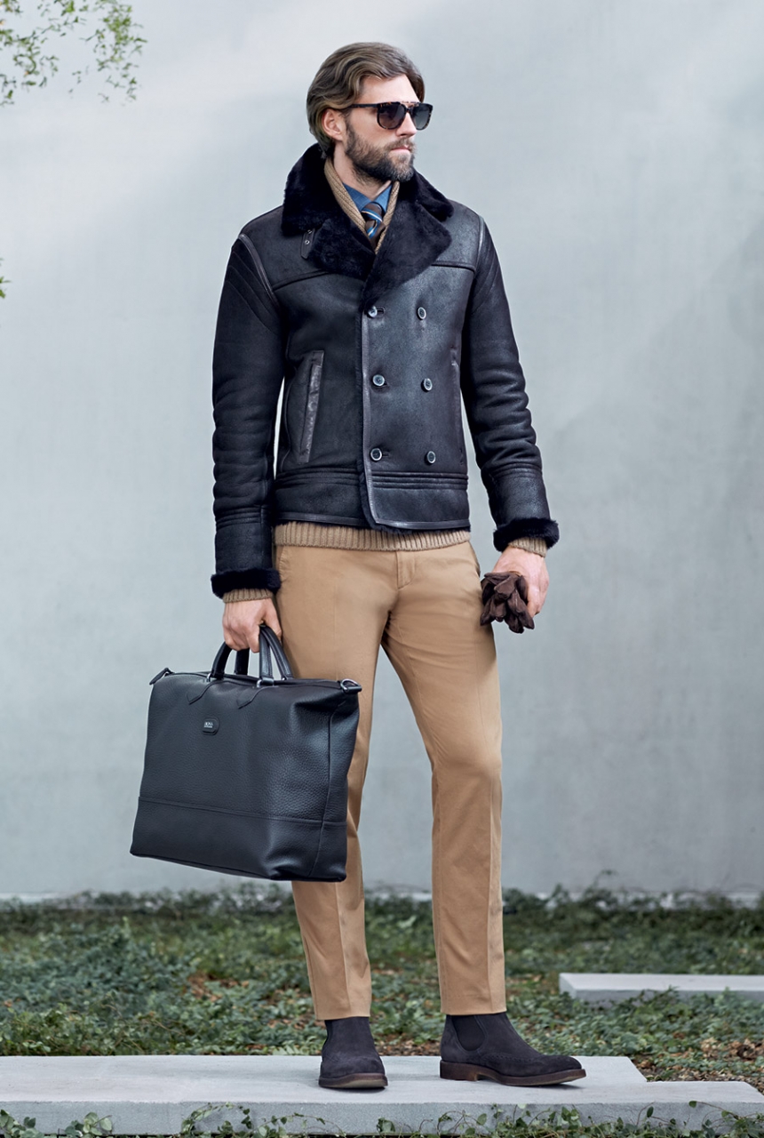 - Dabei kommen die Individualität des Mannes und seine Ausstrahlung deutlich zum Ausdruck. Ein Leder-Lammfellmantel mit schwarzem Fell unterstreicht den klassischen Stil perfekt. Das Hemd ist gelungen auf den Ton der Hose abgestimmt, die dem Übergang vom dunklen Leder des Lammfellmantels zur Stahlfarbe der Hose am ehesten entspricht.