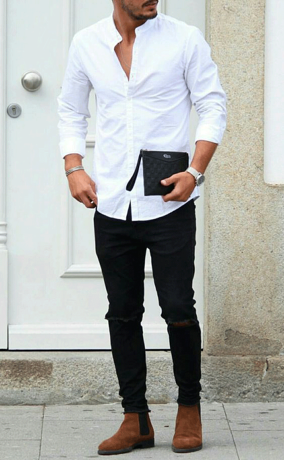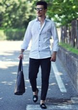 En été, il vaut mieux combiner un pantalon noir avec une chemise beige et retrousser ses manches. Les mocassins beiges seront attrayants sur les jambes.