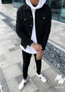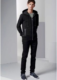 Un nœud dans lequel un jean jogger noir est associé à un pull en tricot gris à capuche sera élégant et intéressant. En tant que vêtement d'extérieur, vous pouvez également utiliser une veste en cuir noire avec un décor sous la forme d'inserts métalliques.