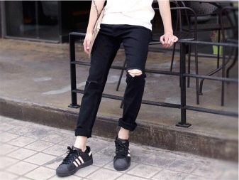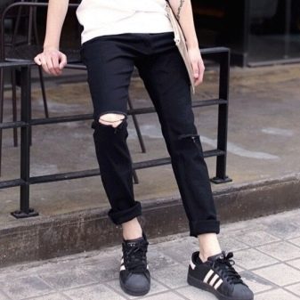 Le jean effiloché est tendance depuis plusieurs saisons. Lors du choix d'un pantalon avec des éraflures, vous devez prendre en compte les composants de leur décor: il existe des modèles avec un dégradé, des coupes, des rivets, des patchs de couleur plus contrastée.
