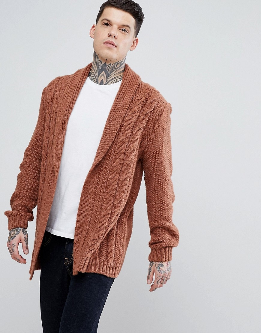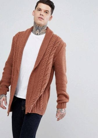 Pour l'automne, il est préférable de combiner un pantalon noir avec un cardigan marron. Le col trapu est actuellement en demande et est à la mode.
