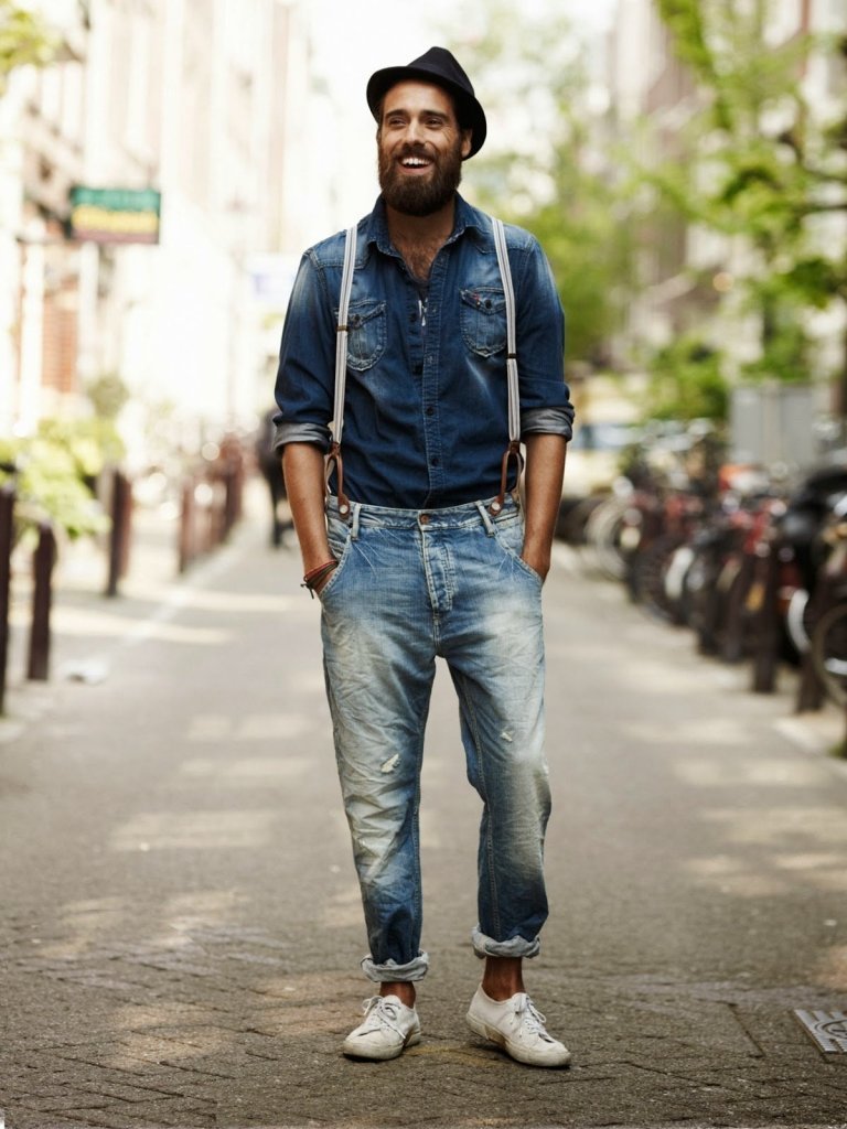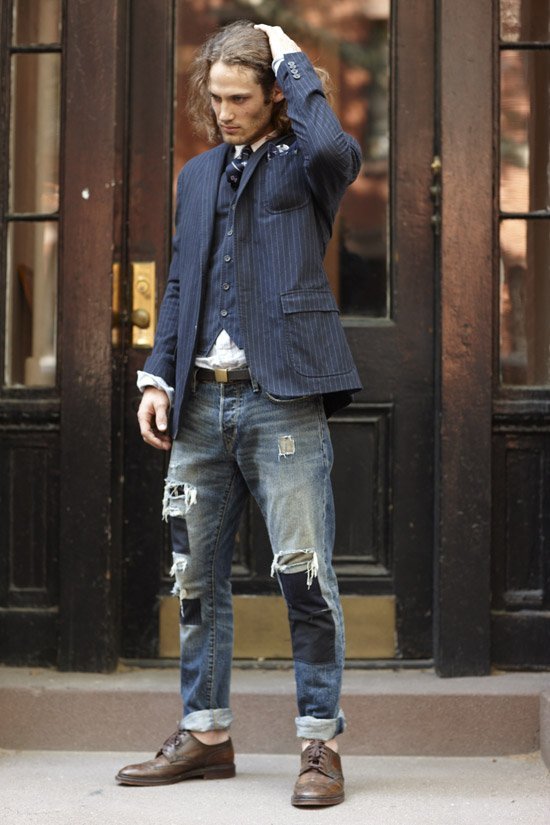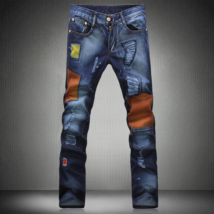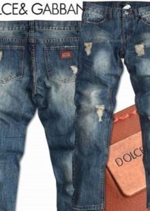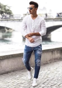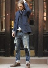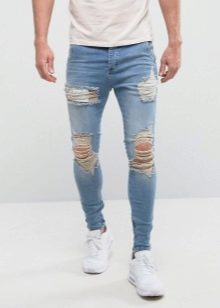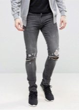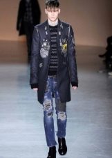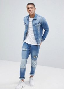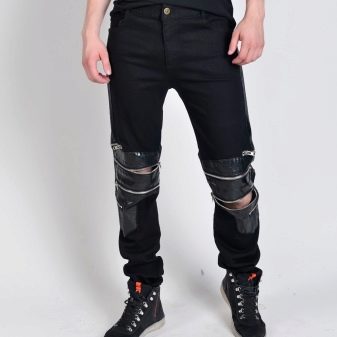 Les options de rocker incluent des jeans avec des fermetures à glissière aux genoux, dans un style grunge, avec un bas recadré. Les hommes créatifs apprécieront les patchs aux couleurs contrastées. Dans ce cas, les patchs peuvent recouvrir totalement ou partiellement les éraflures et les trous. L'option est particulièrement impressionnante lorsque les patchs et les chaussures ou tout élément de l'image sont réalisés en une seule couleur.