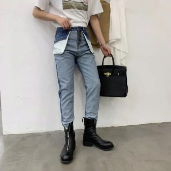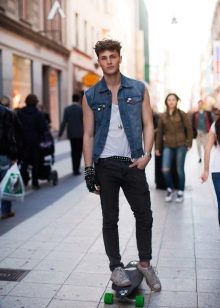 Les modèles excentriques, complétés par des fermetures à glissière dans des endroits inhabituels, des éraflures, des trous ou des patchs peuvent également sembler laconiques. Par exemple, le style surdimensionné avec un jean skinny et un pull surdimensionné conviendra à beaucoup... Les produits en denim se marient bien avec un blouson aviateur, une veste et des t-shirts.