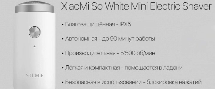 Μεταξύ ολόκληρης της σειράς ξυριστικών μηχανών της Xiaomi, οι πιο δημοφιλείς είναι οι ηλεκτρικές ξυριστικές μηχανές, οι οποίες είναι εξοπλισμένες με τρεις κεφαλές, καθώς διαβάζουν τα πιο τυπικά και παραδοσιακά. Για παράδειγμα, το μοντέλο Soocas So White Electric Shaver διακρίνεται από έναν αξεπέραστο εξωτερικό σχεδιασμό, η αγοραία αξία του οποίου είναι κοντά στα 4.000 ρούβλια. Το μοντέλο διακρίνεται για το μικρό βάρος και το συμπαγές του μέγεθος, γεγονός που αυξάνει σημαντικά την άνεση και την ευκολία χρήσης της συσκευής. Κάθε κεφαλή μπορεί να λειτουργήσει αυτόνομα, ανεξάρτητα από τον τρόπο λειτουργίας του γειτονικού μπλοκ. Χάρη σε αυτήν την τεχνολογία, το ξύρισμα μπορεί να πραγματοποιηθεί ακόμη και στα πιο απρόσιτα σημεία.