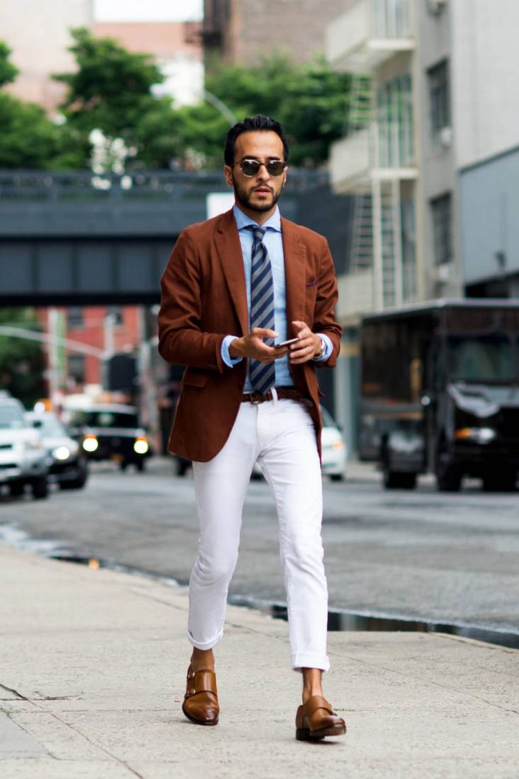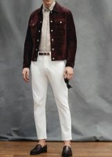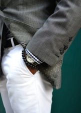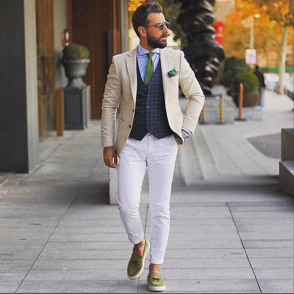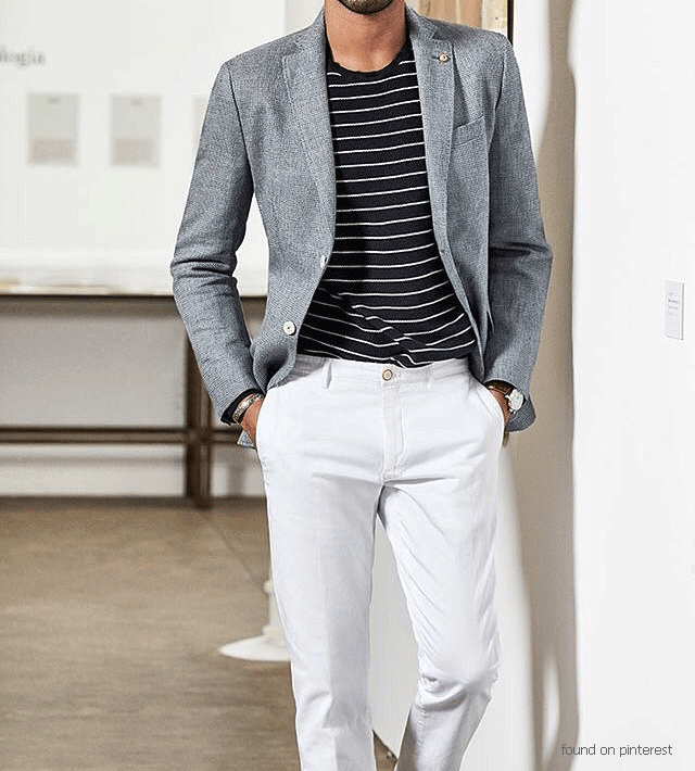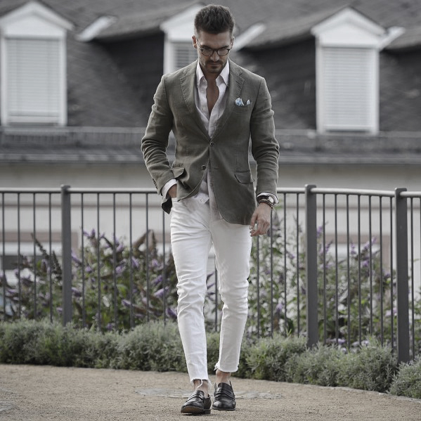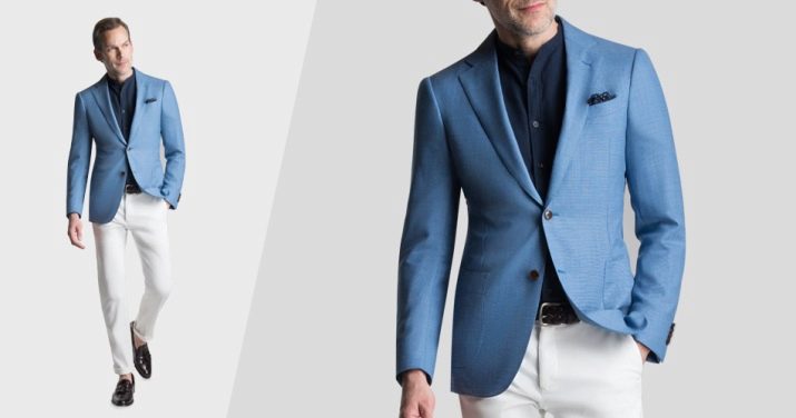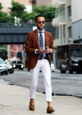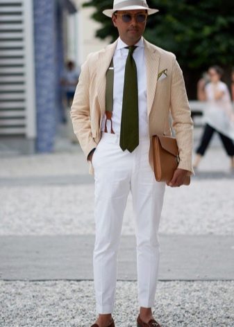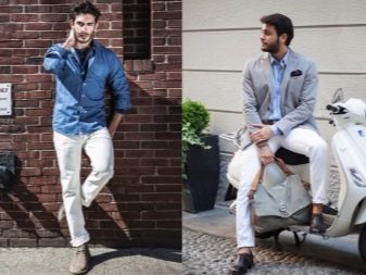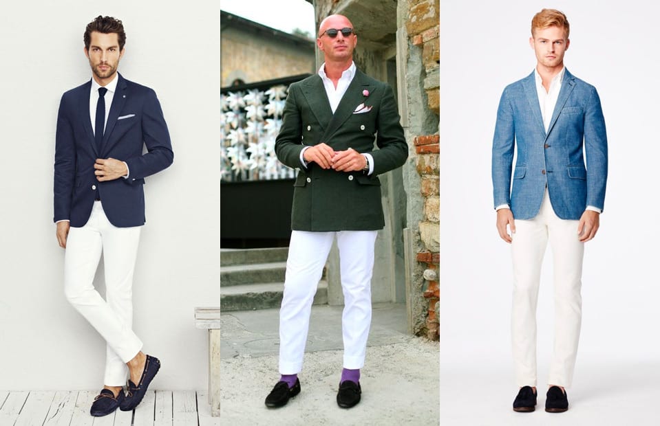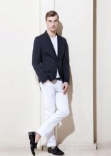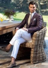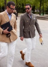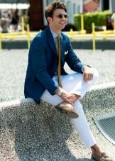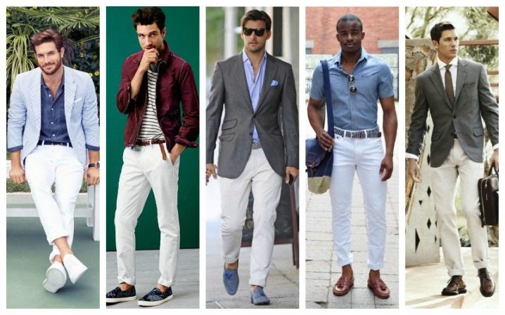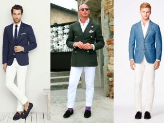 Για casual εμφάνιση, πάρτε ένα σακάκι με δύο κουμπιά σε γκρι, μπλε ή μαύρο χρώμα και συνδυάστε το με λευκό παντελόνι, φωτεινά μπλουζάκια ή πουκάμισα. Ένα τέτοιο σύνολο θα φαίνεται πάντα κομψό και κατάλληλο. Για μια κλασική εμφάνιση στο γραφείο, θα πρέπει να επιλέξετε τα σωστά παπούτσια, για παράδειγμα, παπούτσια Chelsea, brogues, loafers, oxfords. Όσο για τη σκιά των παντελονιών, είναι προτιμότερο να επιλέξετε όχι ένα λευκό βραστό μοντέλο, αλλά σε αποχρώσεις εκρού, μαργαριτάρια, γάλα. Η κορυφή είναι κατάλληλη εδώ όσο το δυνατόν πιο λακωνικά - ένα πουκάμισο μονόχρωμο ή διακριτικά τυπωμένο.