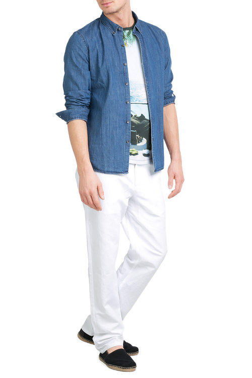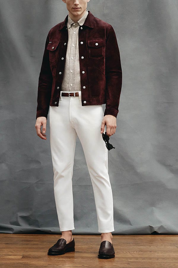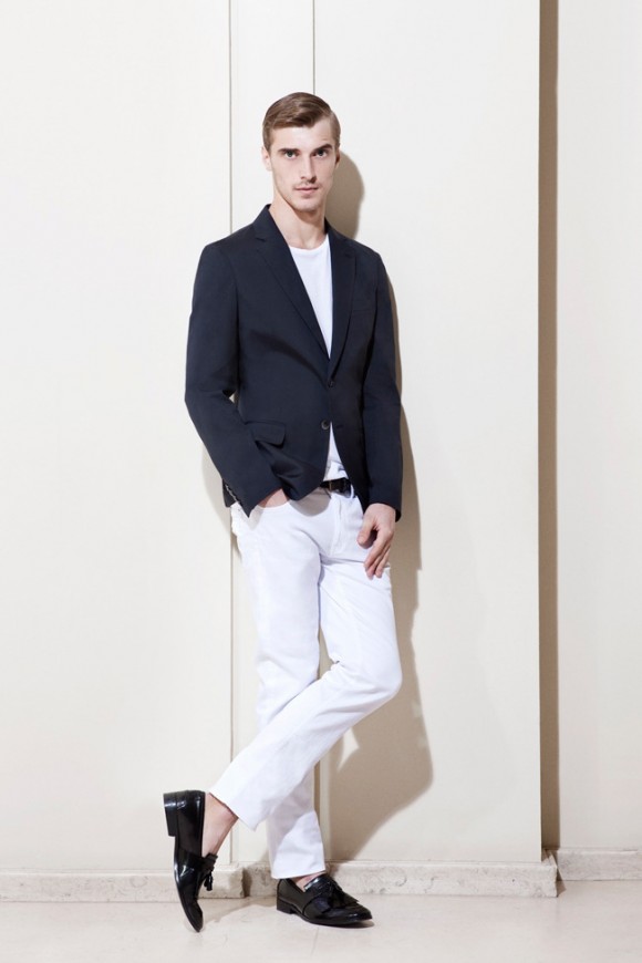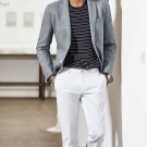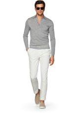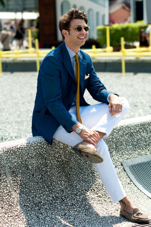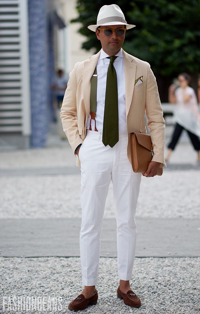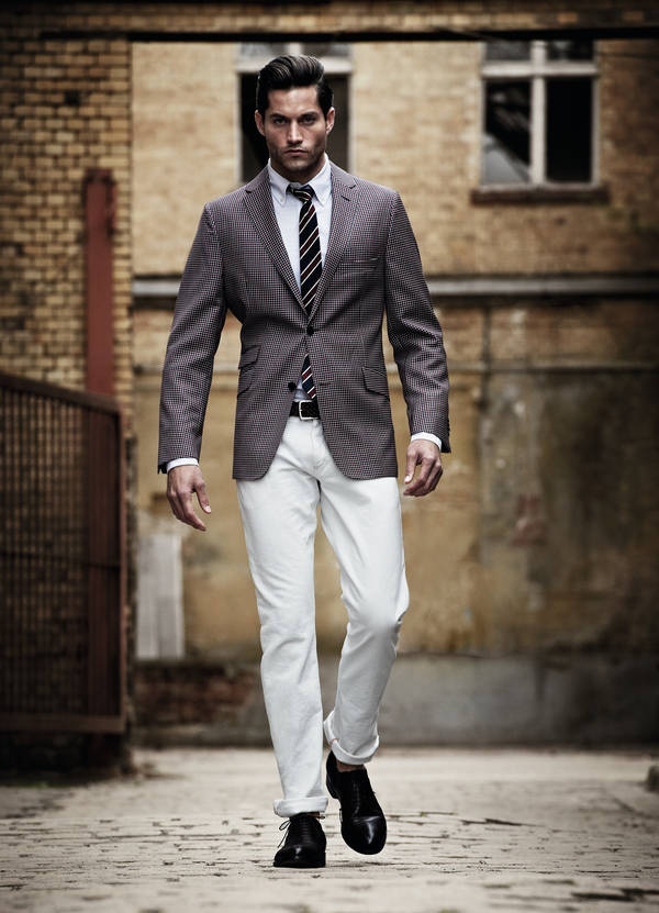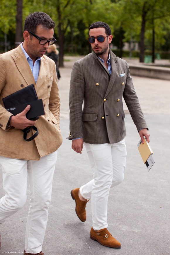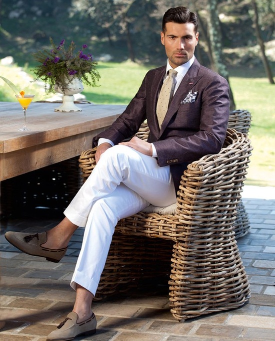 Για casual εμφάνιση, πάρτε ένα σακάκι με δύο κουμπιά σε γκρι, μπλε ή μαύρο χρώμα και συνδυάστε το με λευκό παντελόνι, φωτεινά μπλουζάκια ή πουκάμισα. Ένα τέτοιο σύνολο θα φαίνεται πάντα κομψό και κατάλληλο. Για μια κλασική εμφάνιση στο γραφείο, θα πρέπει να επιλέξετε τα σωστά παπούτσια, για παράδειγμα, παπούτσια Chelsea, brogues, loafers, oxfords. Όσο για τη σκιά των παντελονιών, είναι προτιμότερο να επιλέξετε όχι ένα λευκό βραστό μοντέλο, αλλά σε αποχρώσεις εκρού, μαργαριτάρια, γάλα. Η κορυφή είναι κατάλληλη εδώ όσο το δυνατόν πιο λακωνικά - ένα πουκάμισο μονόχρωμο ή διακριτικά τυπωμένο.