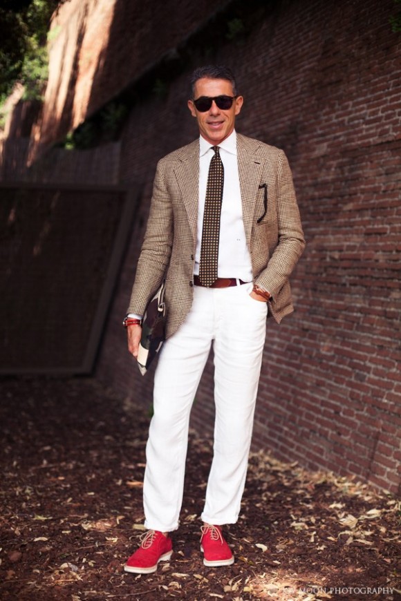 - είναι πολύ σημαντικό να ταιριάζει αρμονικά το λευκό παντελόνι στην εικόνα, διαφορετικά η πιθανότητα να φανεί γελοία είναι μεγάλη.