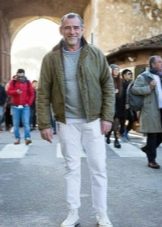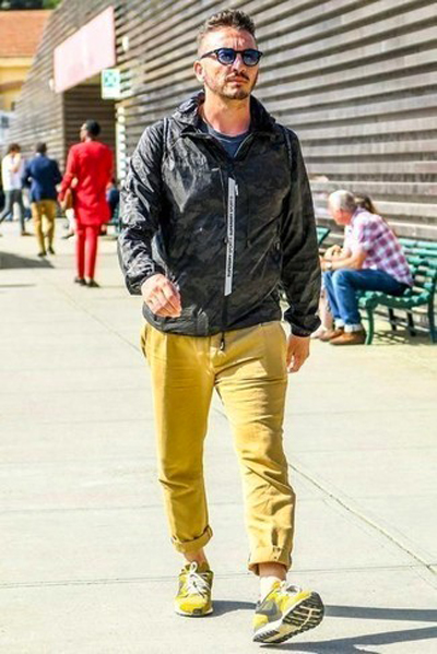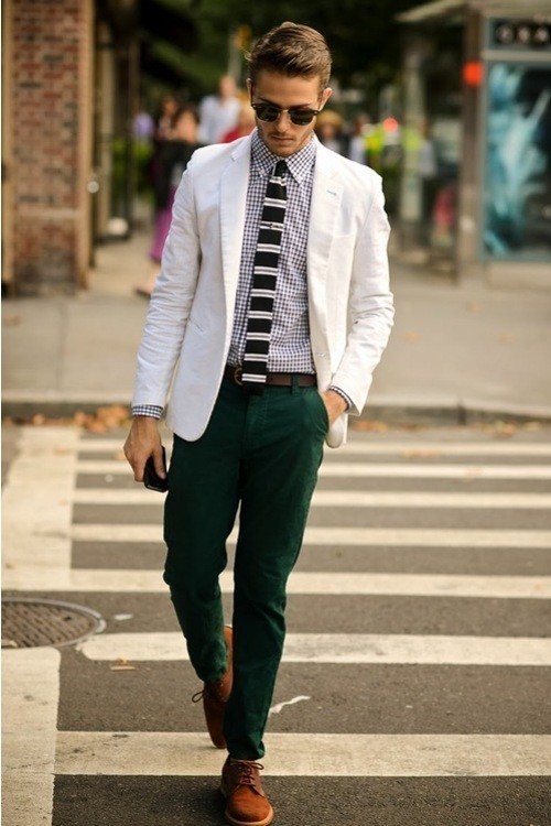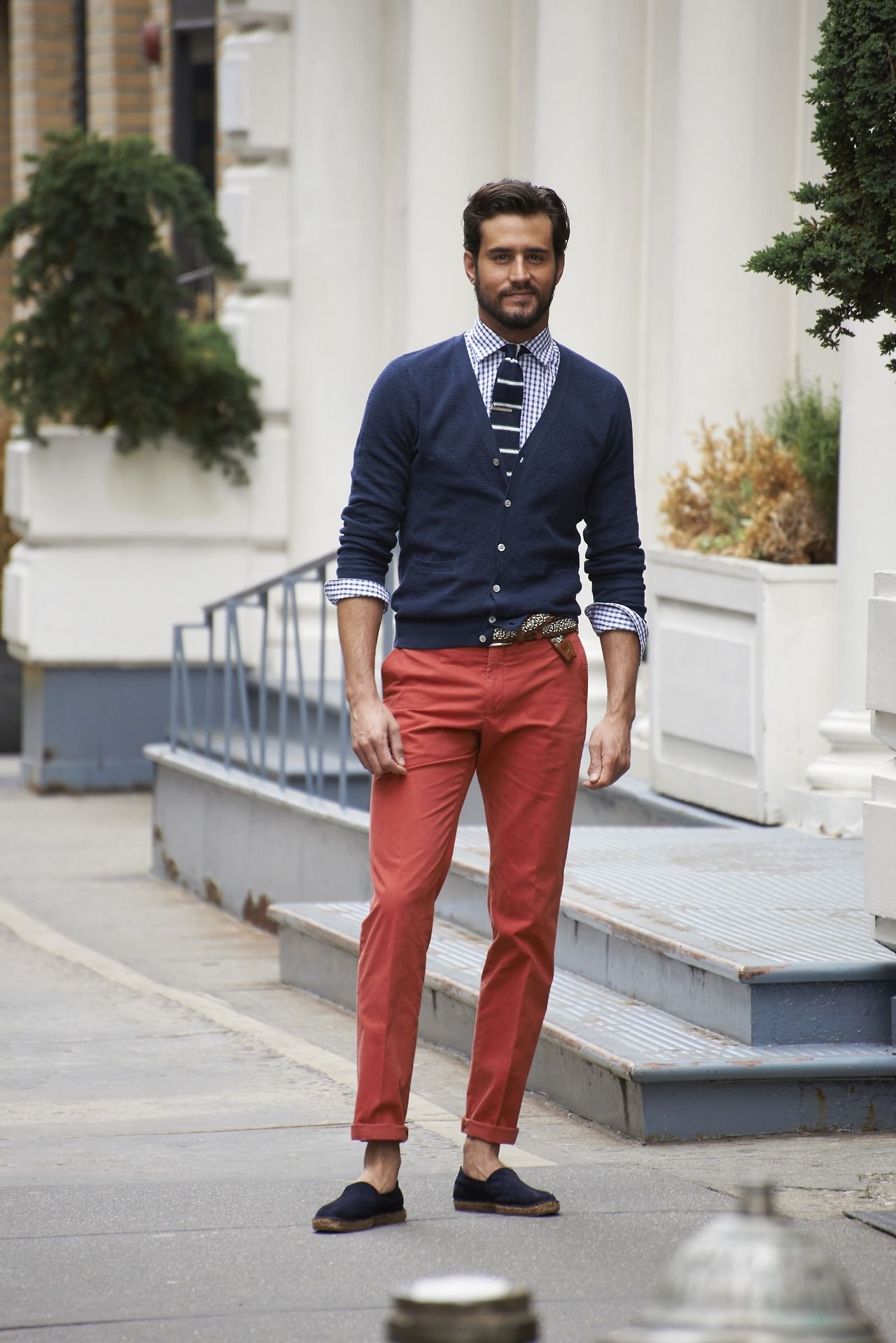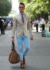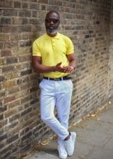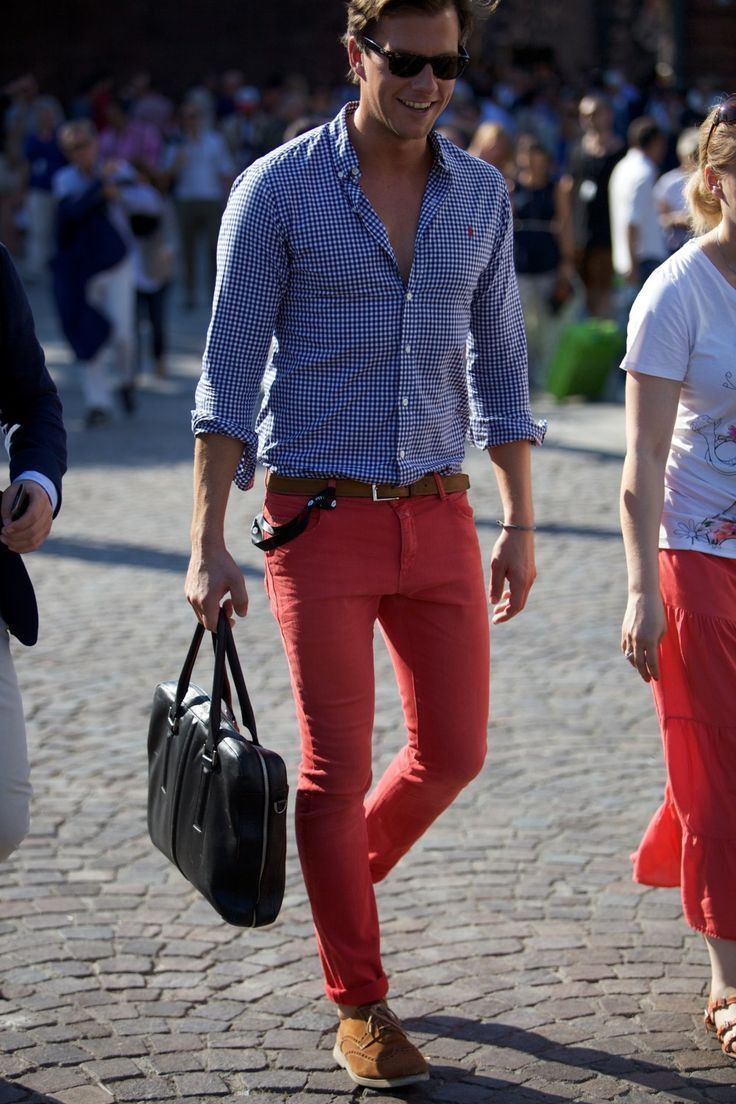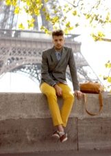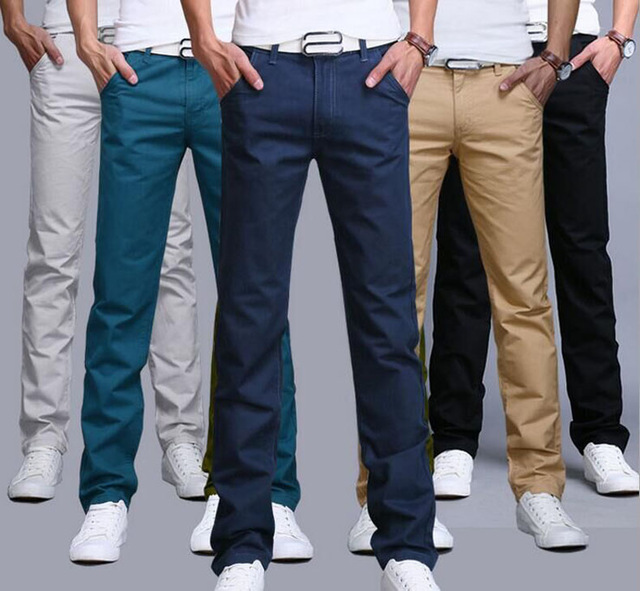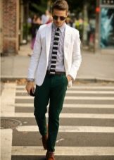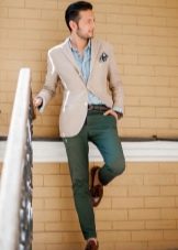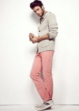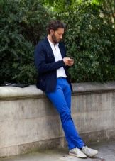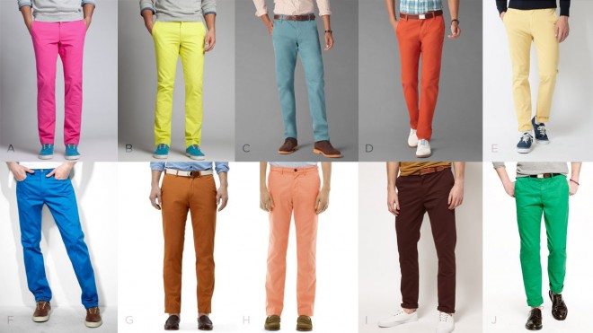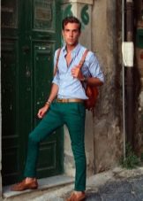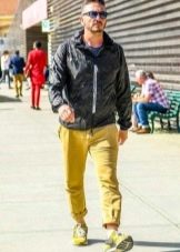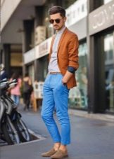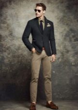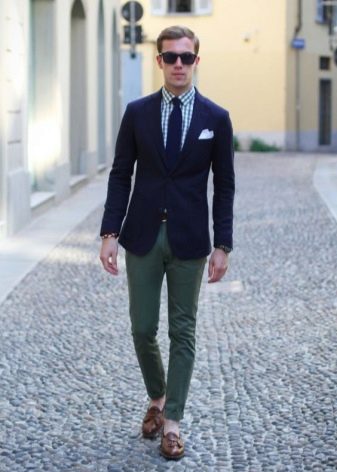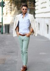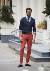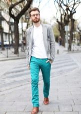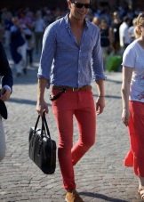 Τα μαύρα και σκούρα μπλε chinos δεν φαίνονται λιγότερο ενδιαφέροντα., δημιουργούν μια κομψή σύνθεση με λευκά και τούβλα χρώματος ρούχα. Οι πιο τολμηροί άνδρες μπορούν να πειραματιστούν με μια εξαιρετικά φωτεινή παλέτα, συνδυάζοντας κόκκινα, μπορντό, ροζ και κίτρινα παντελόνια με μπλέιζερ, μπουφάν και φούτερ. Μπλε παντελόνια με ανοιχτό πορτοκαλί ή σκούρα κατακόκκινα σακάκια φαίνονται επίσης υπέροχα. Για να αποκτήσετε μια εντυπωσιακή εμφάνιση, οι στιλίστες συνιστούν να επιλέξετε αντικείμενα σε ένα κλουβί, είναι κατάλληλα για πολλά στυλ ταυτόχρονα: ροκ, αθλητικά, στρατιωτικά και χιπ-χοπ.