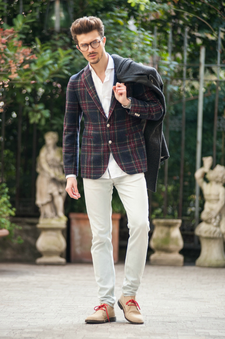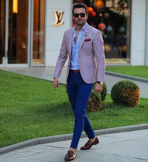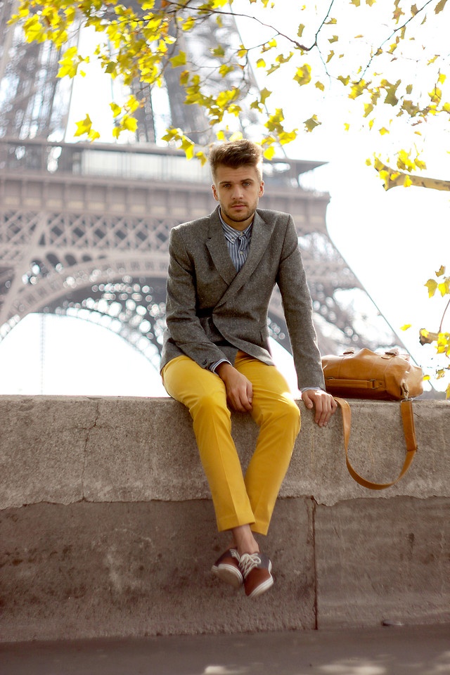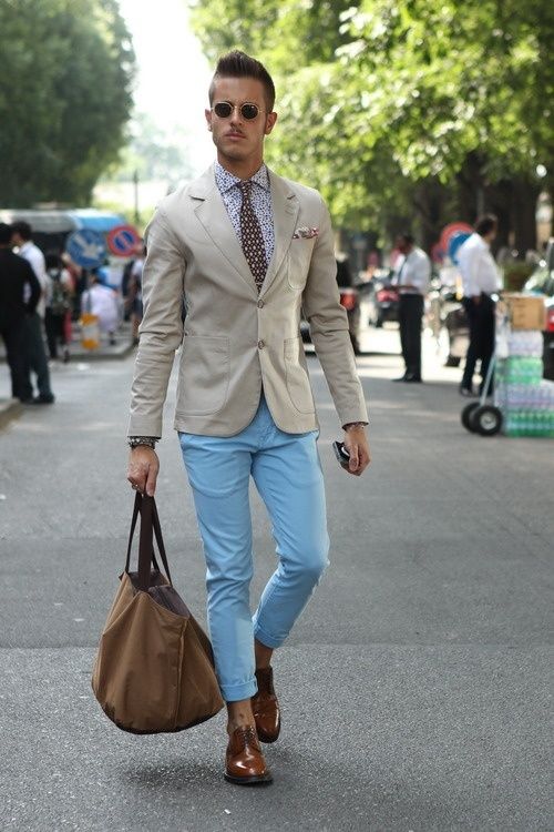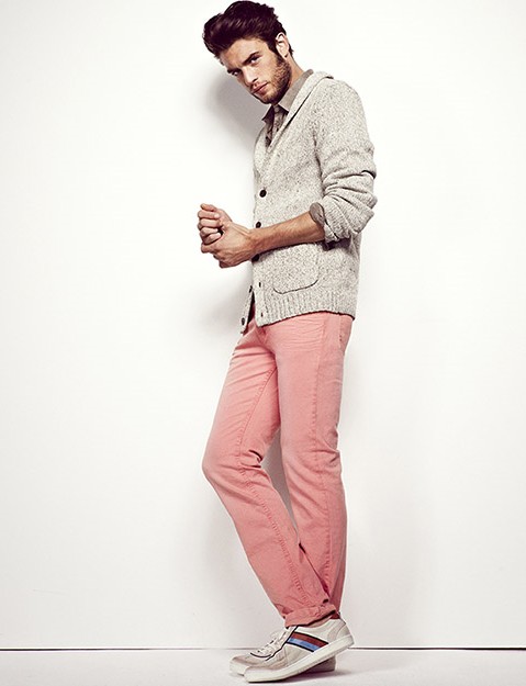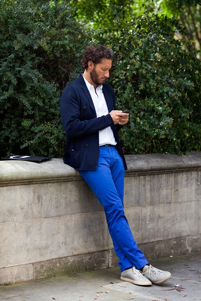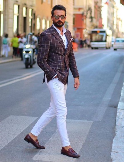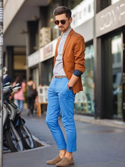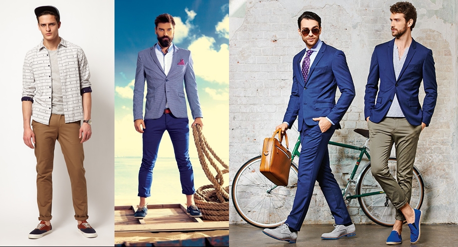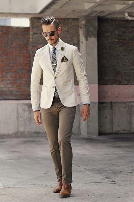 Τα μαύρα και σκούρα μπλε chinos δεν φαίνονται λιγότερο ενδιαφέροντα., δημιουργούν μια κομψή σύνθεση με λευκά και τούβλα χρώματος ρούχα. Οι πιο τολμηροί άνδρες μπορούν να πειραματιστούν με μια εξαιρετικά φωτεινή παλέτα, συνδυάζοντας κόκκινα, μπορντό, ροζ και κίτρινα παντελόνια με μπλέιζερ, μπουφάν και φούτερ. Μπλε παντελόνια με ανοιχτό πορτοκαλί ή σκούρα κατακόκκινα σακάκια φαίνονται επίσης υπέροχα. Για να αποκτήσετε μια εντυπωσιακή εμφάνιση, οι στιλίστες συνιστούν να επιλέξετε αντικείμενα σε ένα κλουβί, είναι κατάλληλα για πολλά στυλ ταυτόχρονα: ροκ, αθλητικά, στρατιωτικά και χιπ-χοπ.
