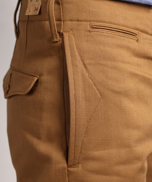 Το Chinos εμφανίστηκε για πρώτη φορά στα μέσα του 19ου αιώνα.... Ενώ ράβανε ρούχα για αποικιακούς στρατιώτες στην Ινδία, οι σχεδιαστές είχαν ως αποστολή να δημιουργήσουν ένα ελαφρύ και ευέλικτο μοντέλο που δεν θα περιορίζει την κίνηση. Δανείστηκαν το στυλ από τα παραδοσιακά ινδικά παντελόνια, αντικαθιστώντας το λερωμένο χιονισμένο χρώμα τους με μια πιο πρακτική απόχρωση χακί. Το αποτέλεσμα είναι ένα ενδιαφέρον μοντέλο που είναι πολύ δημοφιλές στην εποχή μας.