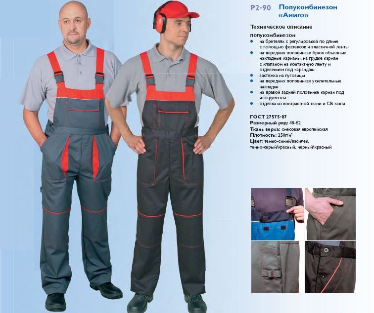 Όλες οι φόρμες επισημαίνονται ανάλογα με τον σκοπό. Τα ανδρικά παντελόνια εργασίας ταξινομούνται ανάλογα με τον βαθμό προστασίας από δυσμενείς περιβαλλοντικές επιδράσεις. Υπάρχουν δύο τύποι προστασίας των ποδιών: