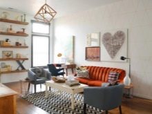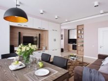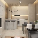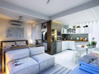 - Δεν υπάρχει αρκετός χώρος, αλλά αρκετός - τόσο για να μην είστε γεμάτοι στον καναπέ, όσο και για να μαγειρεύετε μαζί στην κουζίνα... Πάντα θα υπάρχει πολύ φως σε ένα τέτοιο δωμάτιο. Το ρόλο του ζωνάτο αναλαμβάνει τόσο ο γυρισμένος καναπές όσο και η διακόσμηση της οροφής.