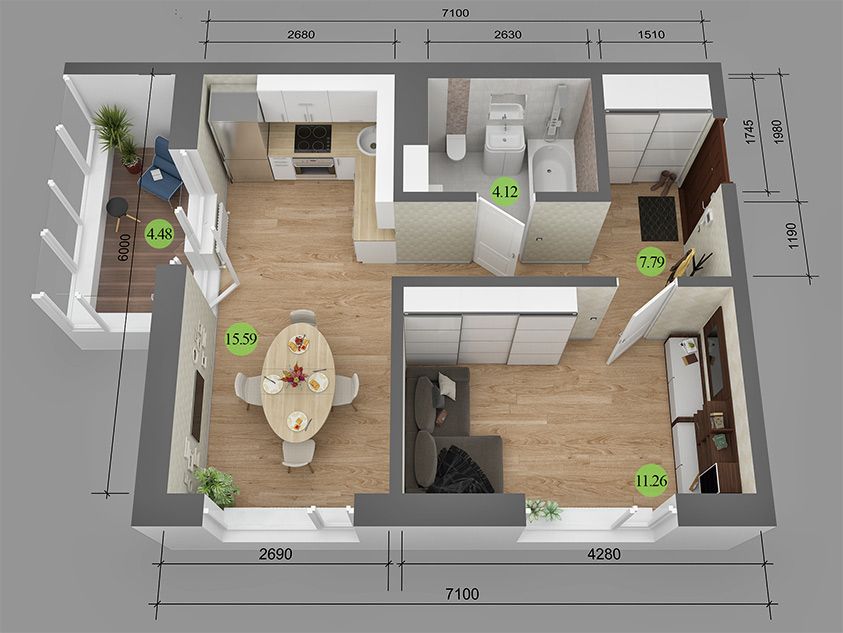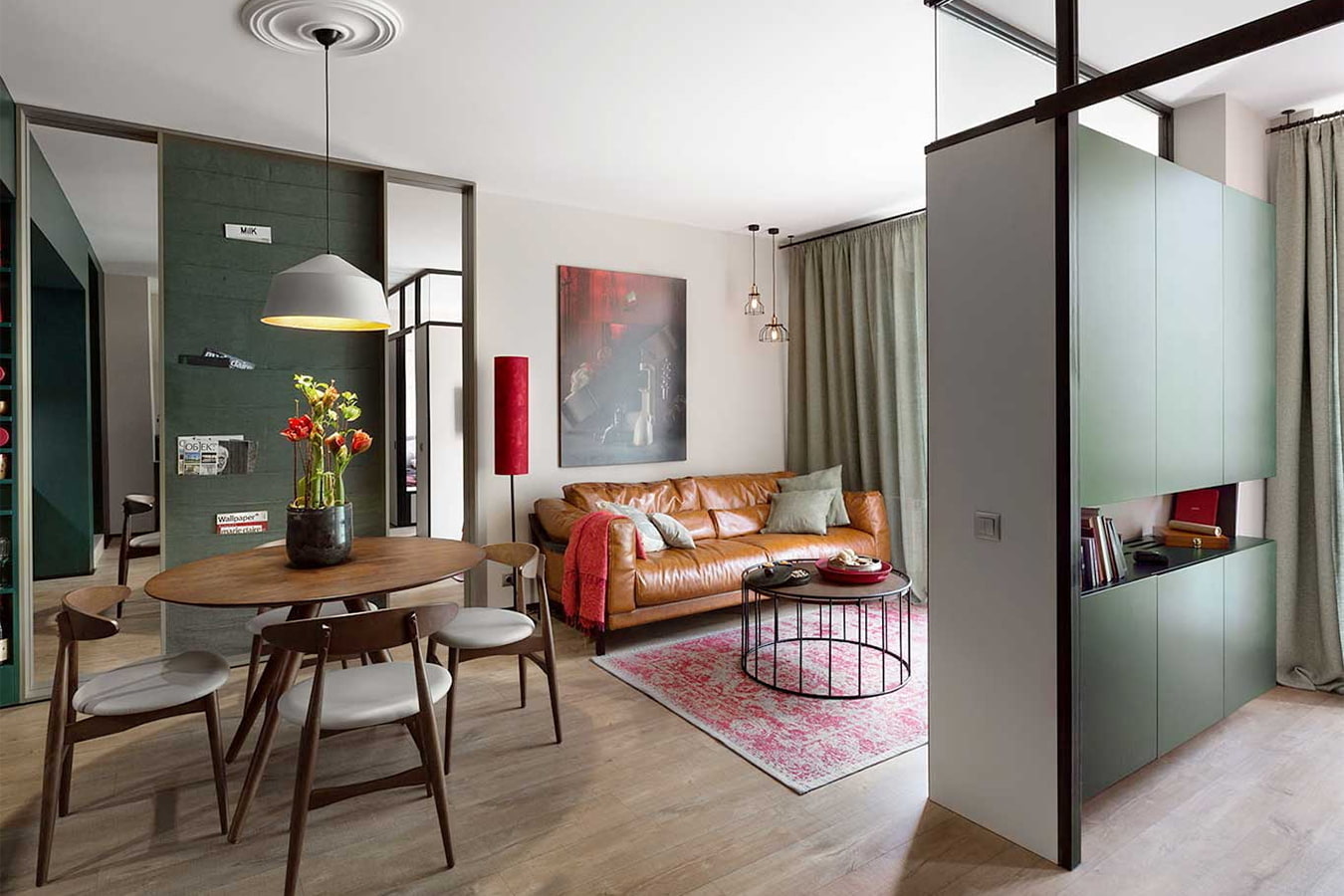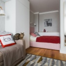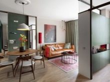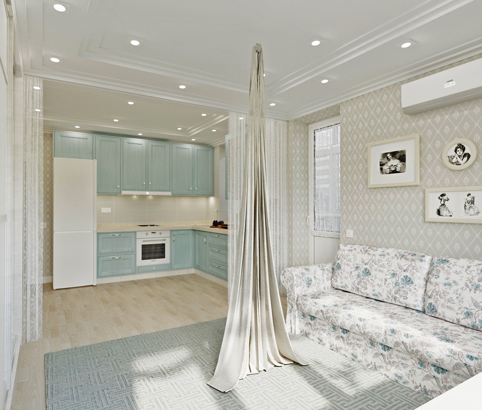 Η ζώνη σε ένα τέτοιο διαμέρισμα δεν πρέπει να είναι παρεμβατική, πολύ εκφραστική. Η απαλή μετάβαση μεταξύ ζωνών δεν «τρώει» τον χώρο.