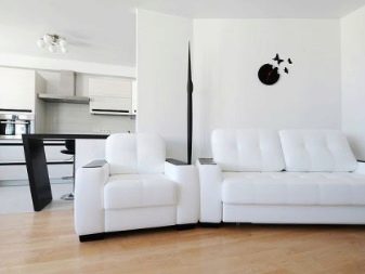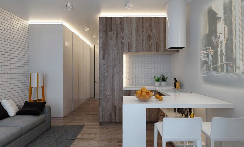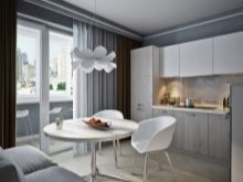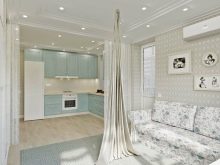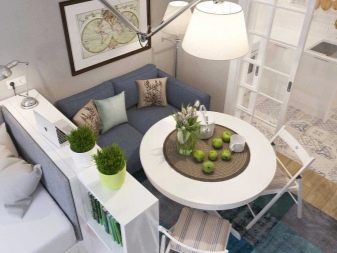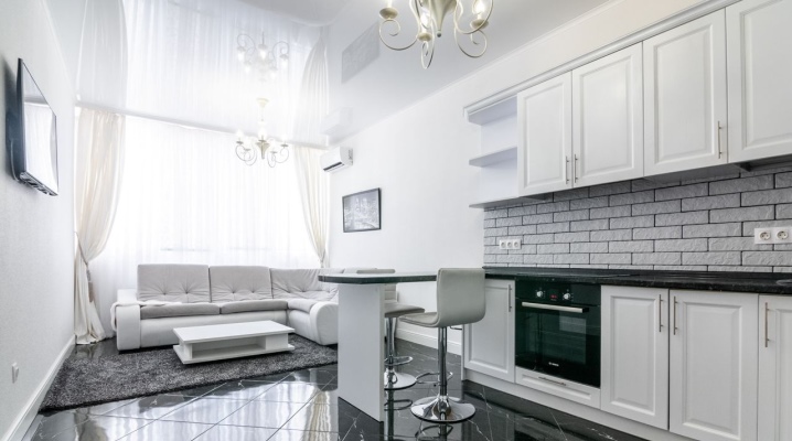 Για να διαχωρίσετε τον χώρο μαγειρέματος από τον τομέα αναψυχής, δεν χρειάζεται να περιφράξετε μαζικά έπιπλα και να σκεφτείτε για μεγάλα χωρίσματα γυψοσανίδας - το πλάνο δεν επιτρέπει μια τέτοια διαίρεση.