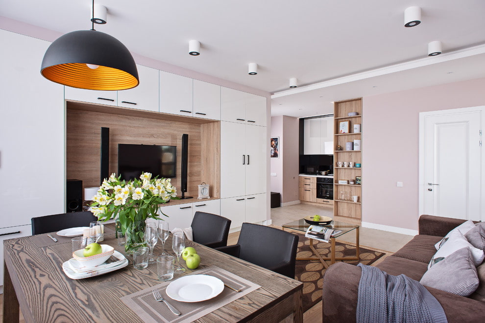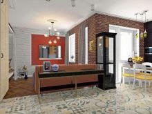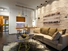- Διαμέρισμα ανοιχτού τύπου χωρίζει την κουζίνα από το σαλόνι και χρησιμεύει ως τοποθεσία ζώνης πολυμέσων. Η τραπεζαρία προορίζεται να βρίσκεται στον τοίχο και πολλές θέσεις, ράφια, βάθρα θα φιλοξενήσουν όλα όσα δεν θέλετε να μεταφέρετε στο δεύτερο δωμάτιο.