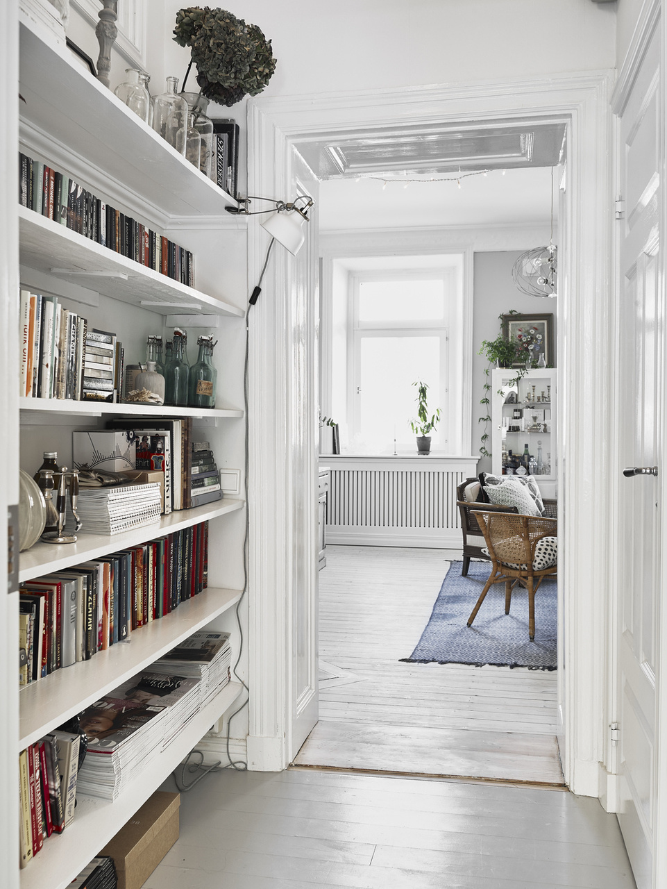 - Μια καλή λύση μπορεί να θεωρηθεί τοποθέτηση της βιβλιοθήκης στο διάδρομο. Χρώματα, υφές - όλα ταιριάζουν τέλεια, ένας μικρός χώρος φαίνεται πολύ άνετος.