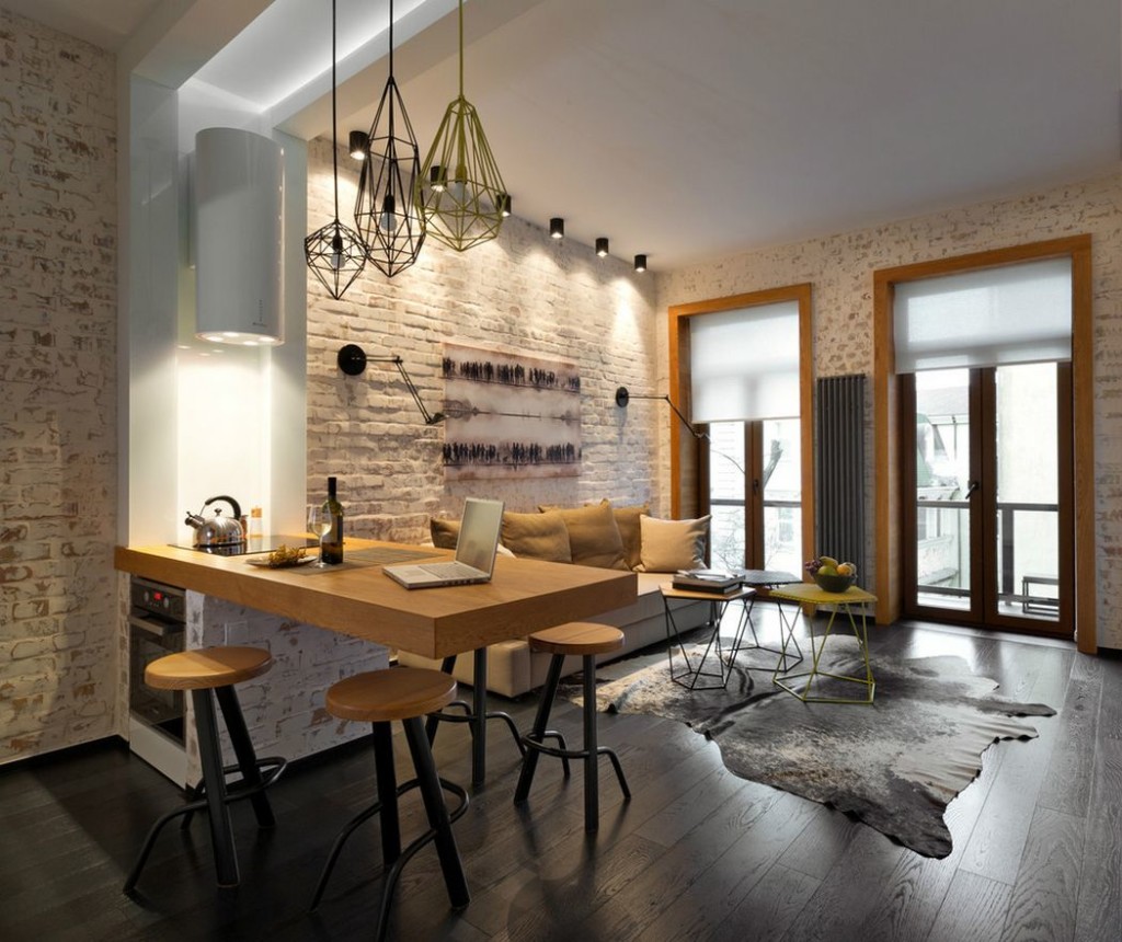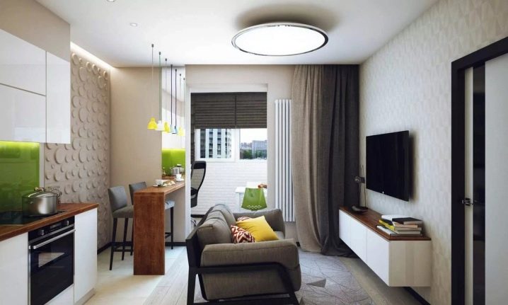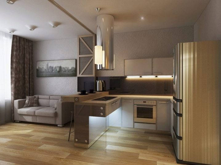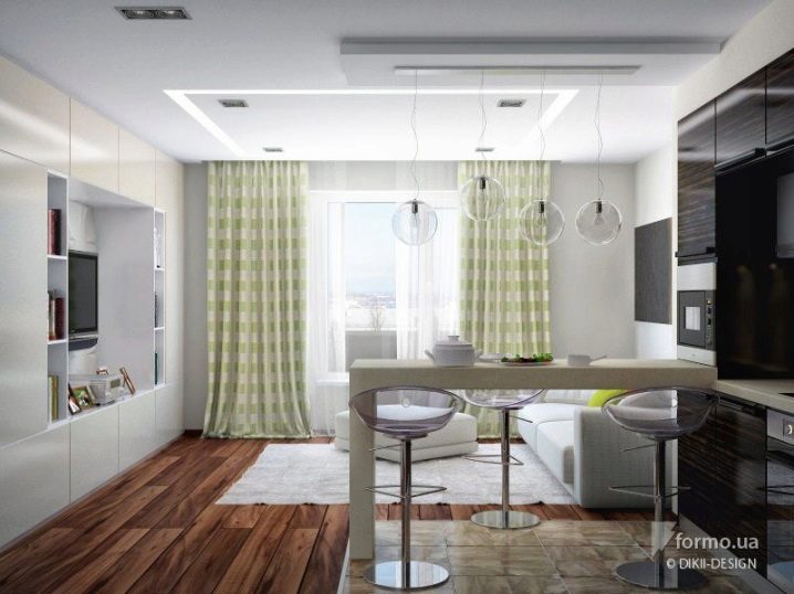 Εάν χωρίσετε το κύριο δωμάτιο σε μικρούς χώρους, είναι δύσκολο να αποφύγετε την αποτυχία.... Το δωμάτιο θα φαίνεται ακόμα μικρότερο και επομένως πρέπει να παλέψετε για το φως, τον αέρα και το χώρο. Ο μετρητής μπαρ μπορεί να λειτουργήσει ως ζώνη ασφαλείας μεταξύ της κουζίνας και του σαλονιού. Και αν το σαλόνι έχει ένα τραπεζάκι σαλονιού που μπορεί να μετατραπεί σε τραπεζαρία, ο πάγκος του μπαρ είναι αρκετά - ένα πλήρες τραπέζι στην κουζίνα δεν χρειάζεται. Αλλά μια οπτικά σαφής και ευχάριστη για τα μάτια διαίρεση θα αποδειχθεί, όχι τόσο βαριά και ριζοσπαστική.