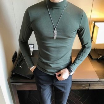- T-shirt Turtleneck στις περισσότερες περιπτώσεις έχει μακρύ μανίκι και λαιμό όρθιο. Αν και στην εμφάνιση τέτοια μοντέλα είναι όσο το δυνατόν πιο παρόμοια με τα πουλόβερ, δημιουργούνται από λεπτό ύφασμα.